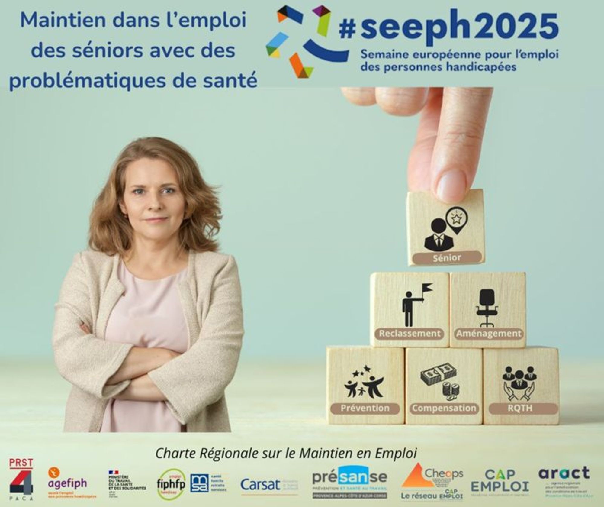 Dans le cadre de la SEEPH (semaine européenne des personnes en situation de handicap), les partenaires de la charte régionale du maintien dans l’emploi et de la prévention de la désinsertion professionnelle de PACA proposent depuis 5 ans, un moment de rencontre aux employeurs, responsables des ressources humaines, salariés, représentants du personnel et partenaires sur cette thématique.