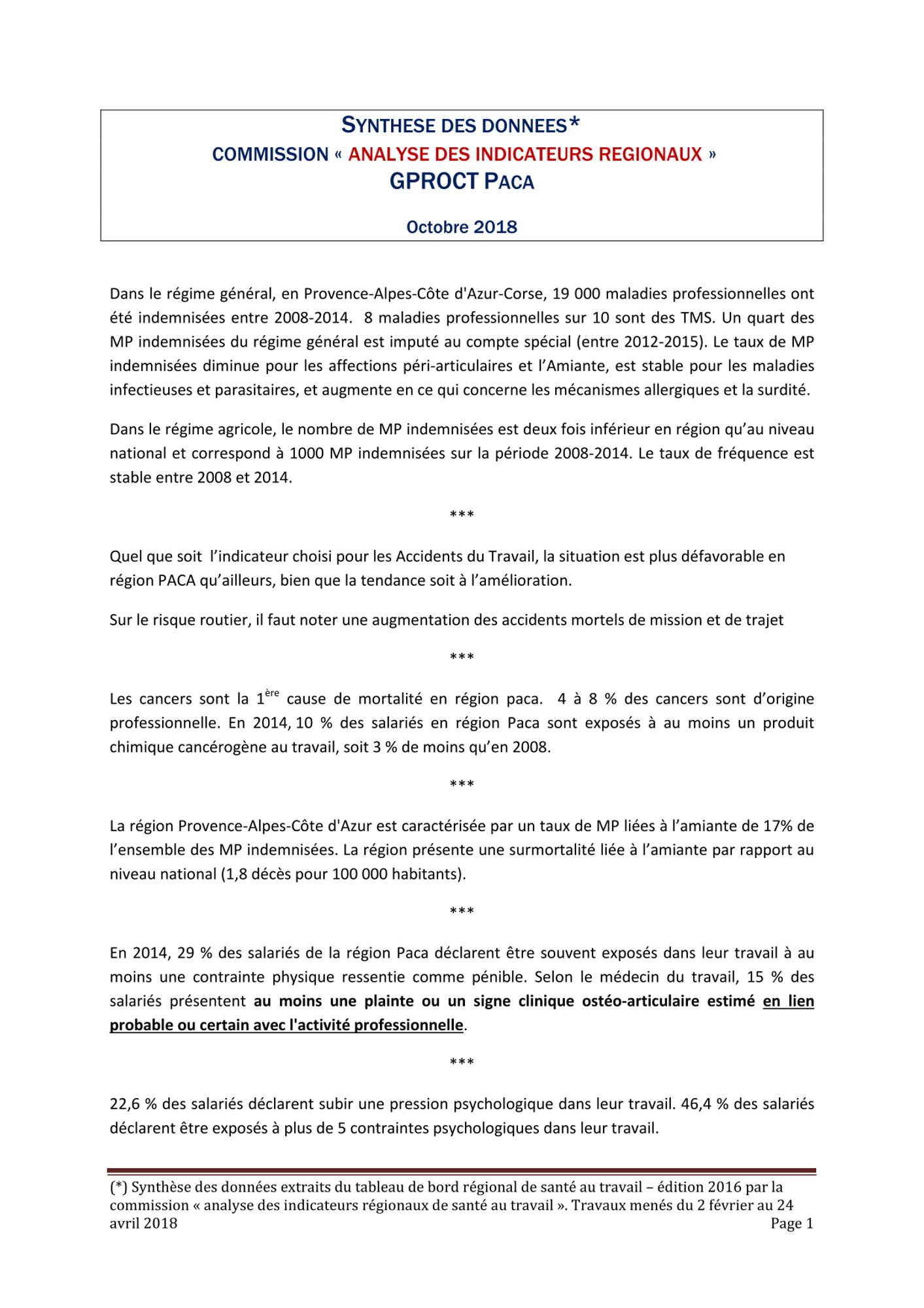 La mission de cette commission consistait en l'analyse des données portées au Tableau de Bord Santé au Travail (TBST), édité en décembre 2016.
