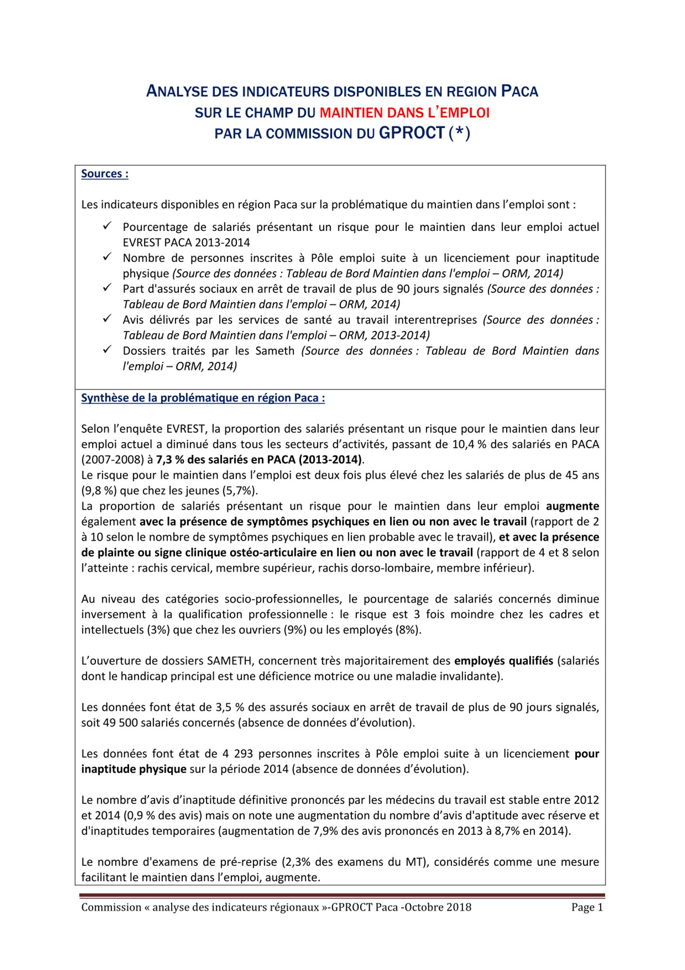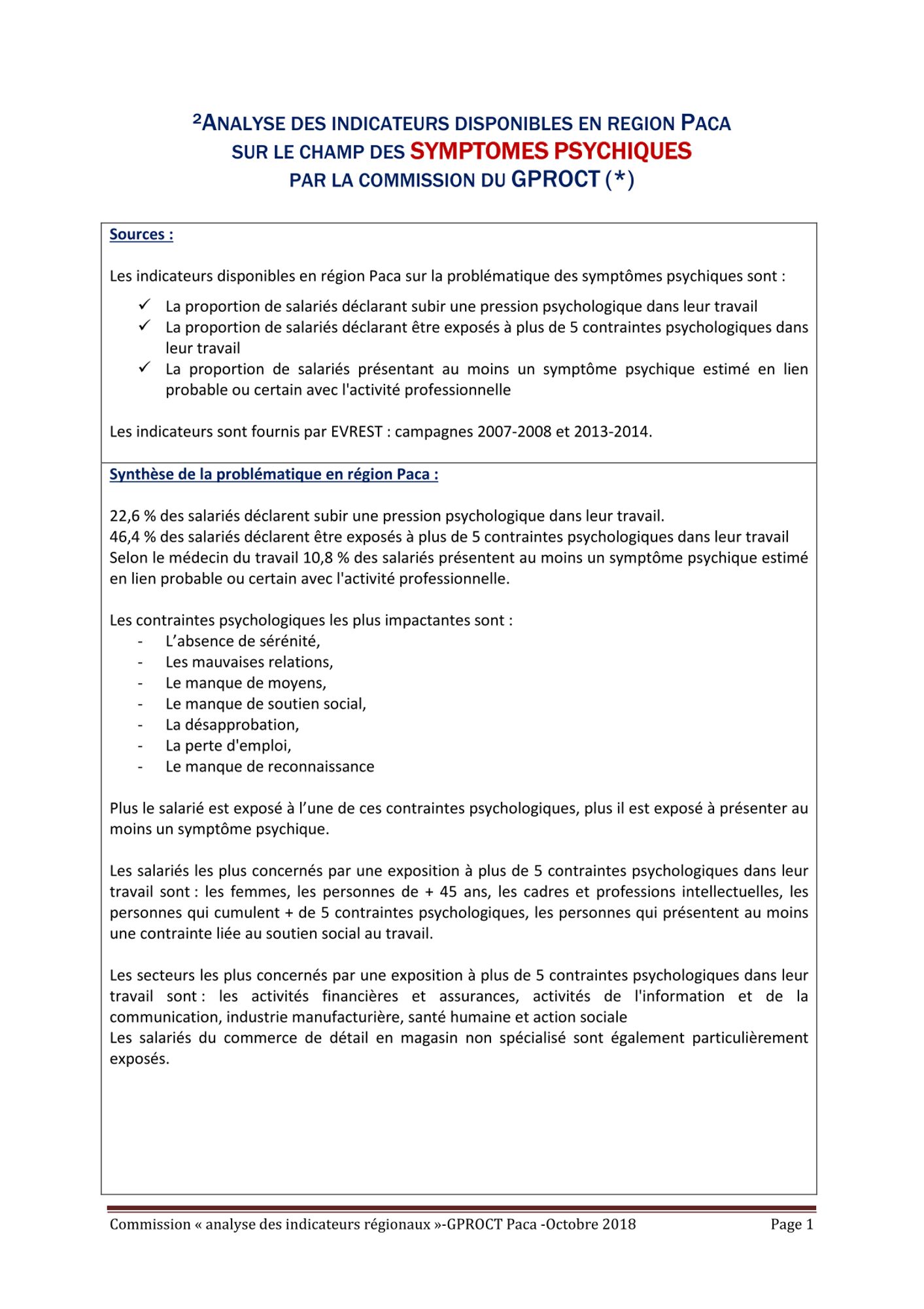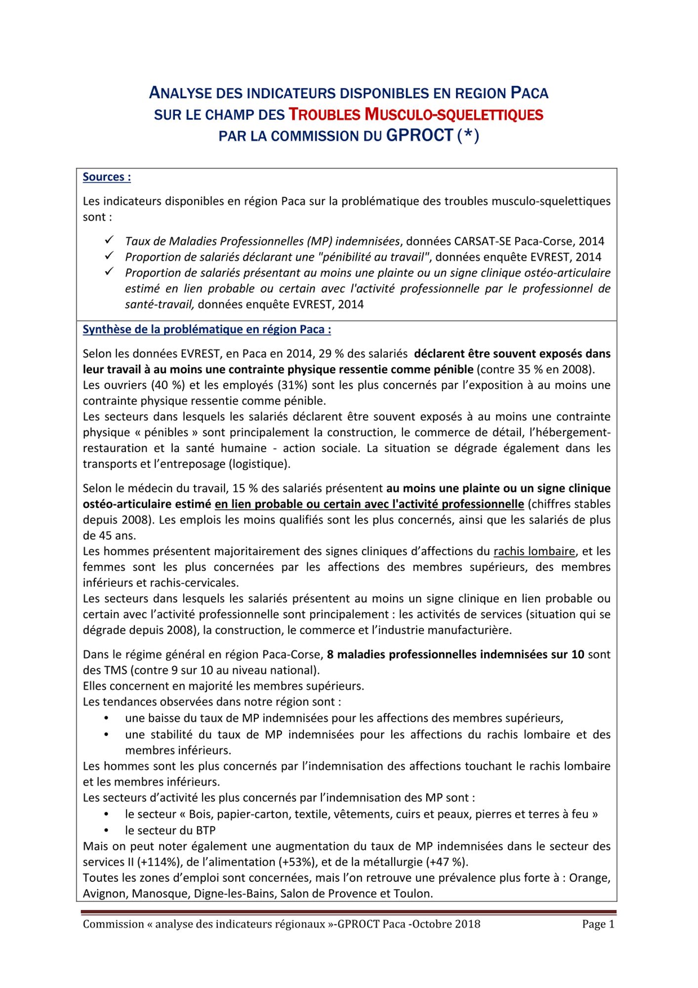 Fiches thématique issues des travaux de la commission technique du GPROCT "Analyse des indicateurs" de 2018.