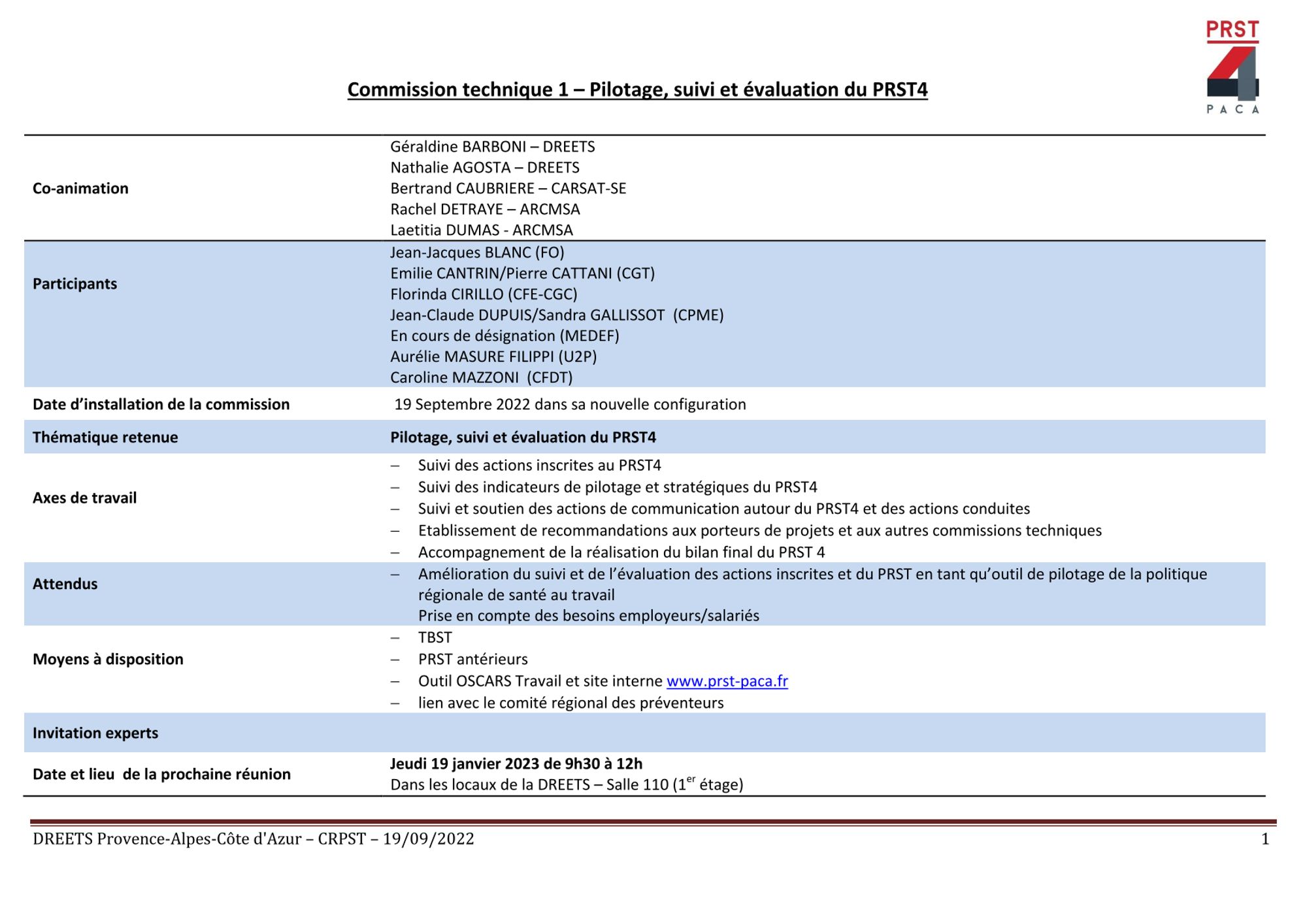 - le pilotage, le suivi et l'évaluation du PRST4 pour la Commission technique n° 1 (CT1) ;