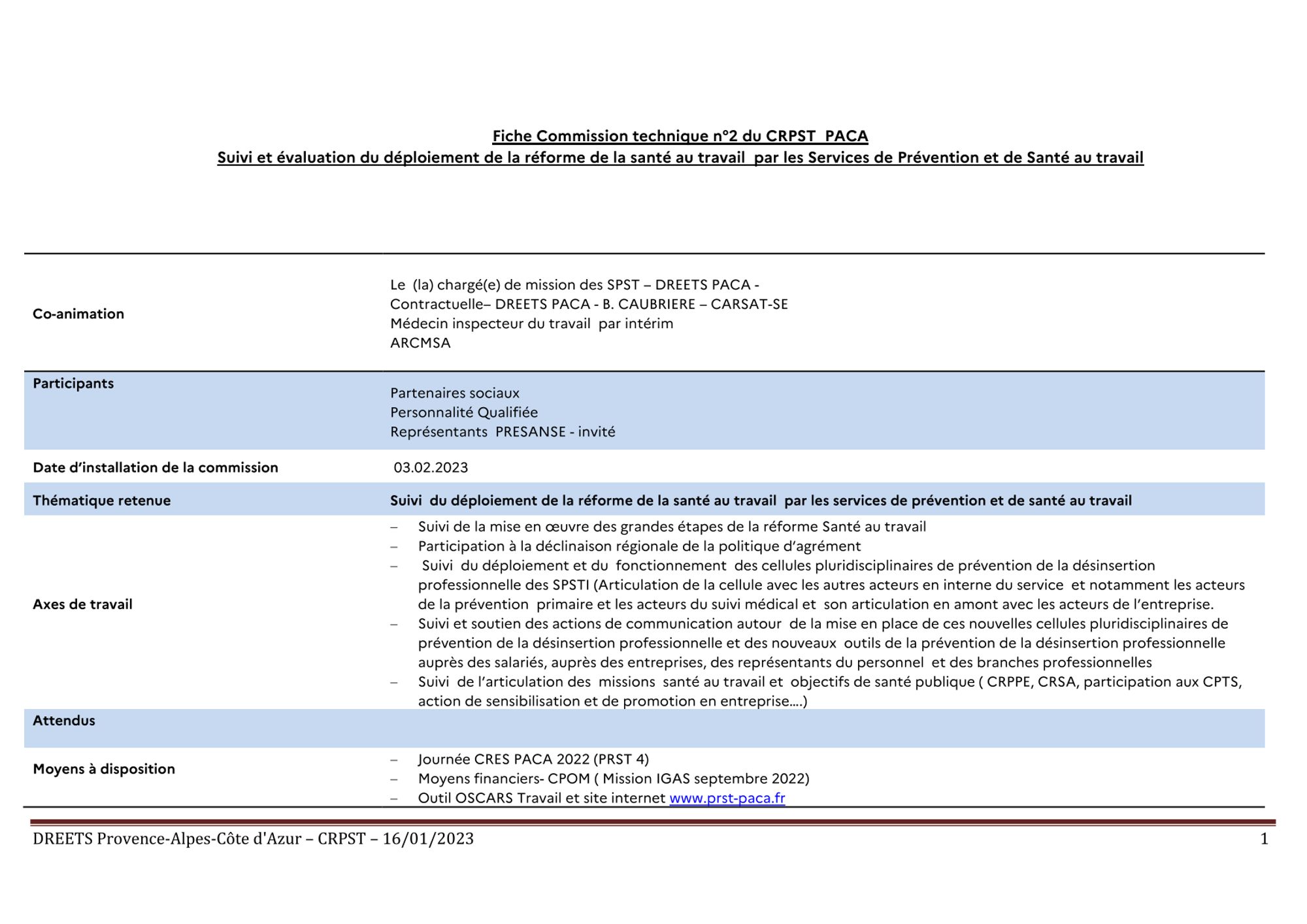 - le suivi et l'évaluation du déploiement de la réforme de la santé au travail par les services de prévention et de santé au travail interentreprises pour la Commission technique n° 2 (CT2).