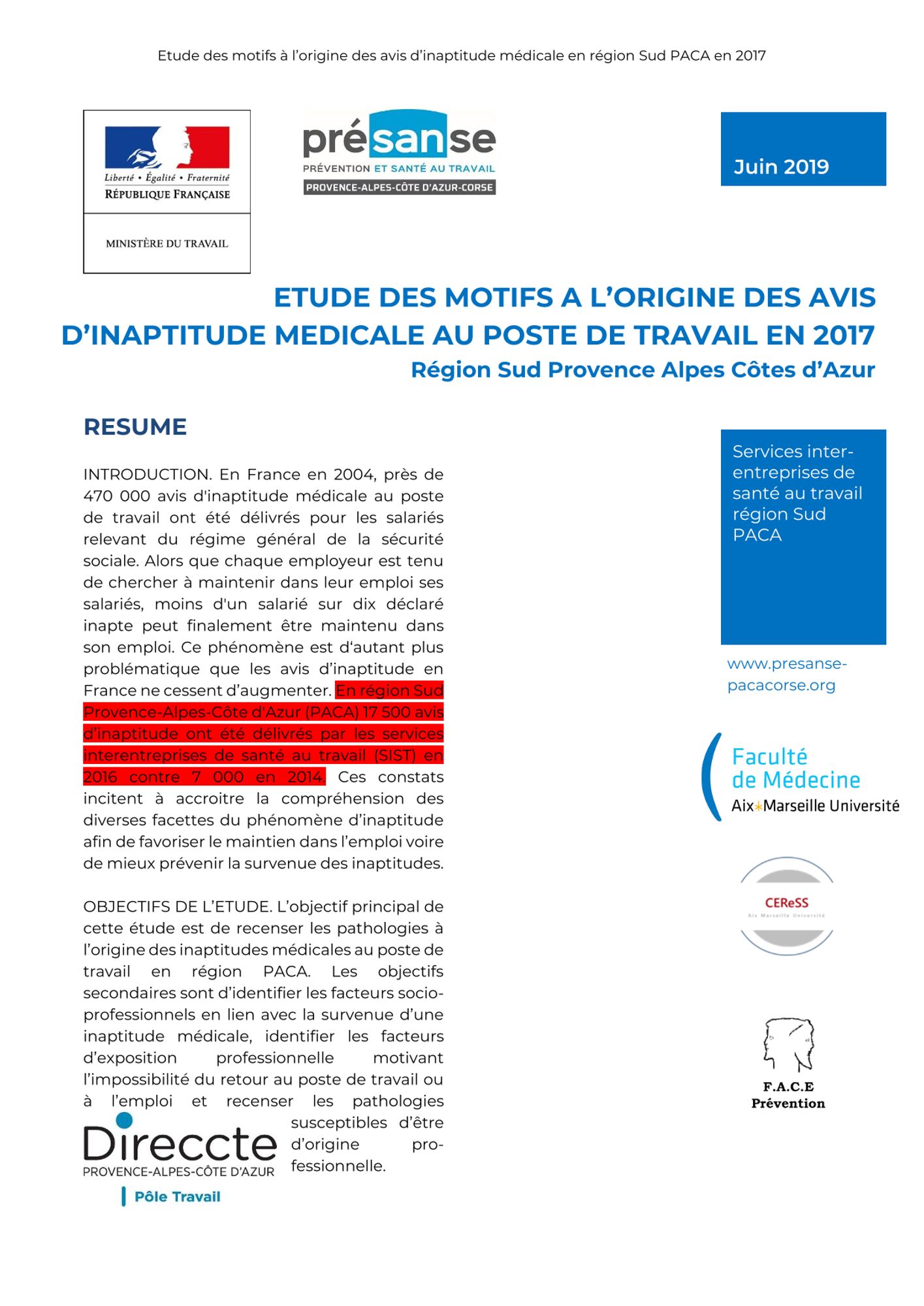 L'objectif principal de cette étude est de recenser les pathologies à l'origine des inaptitudes médicales au poste de travail en région PACA.