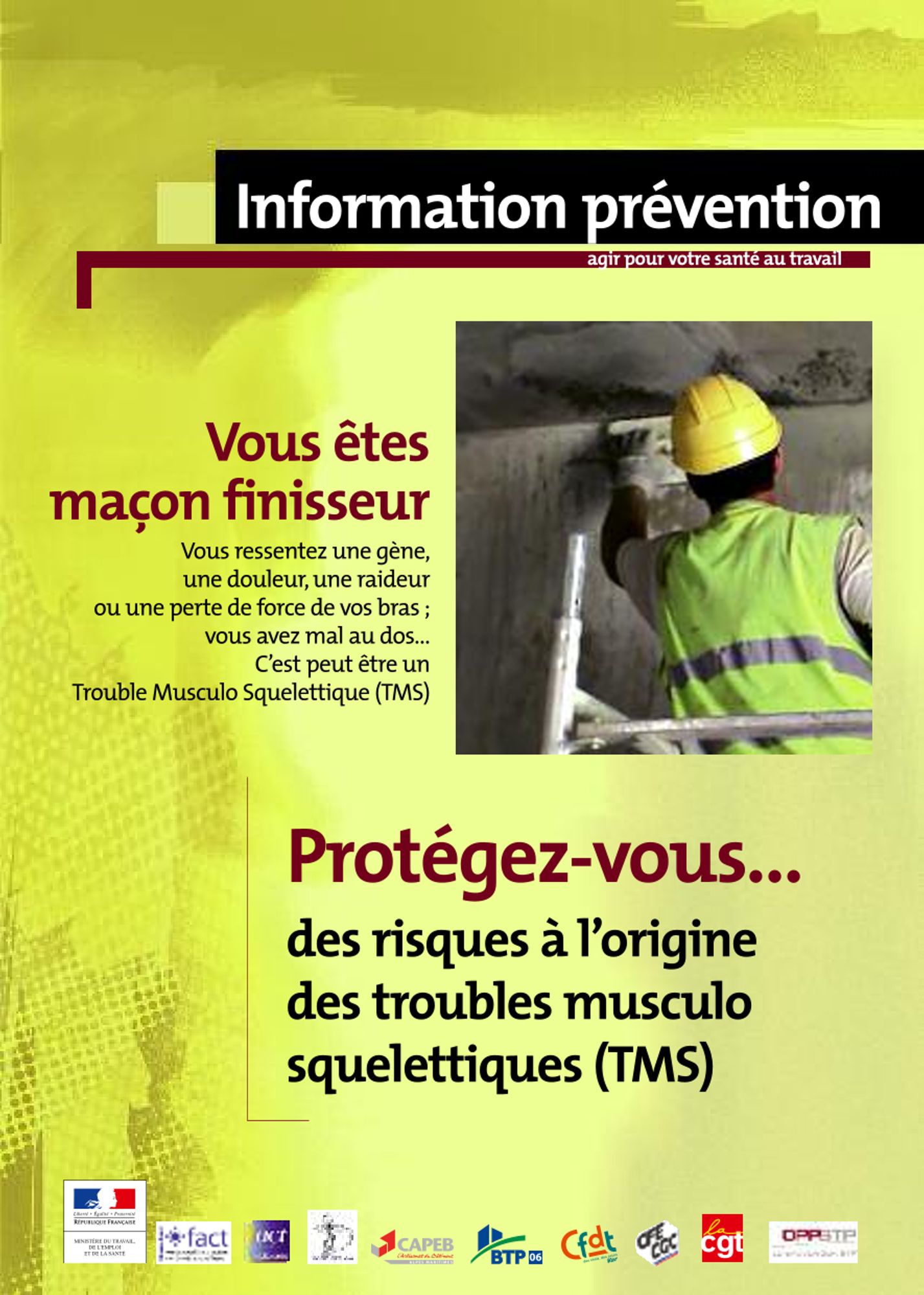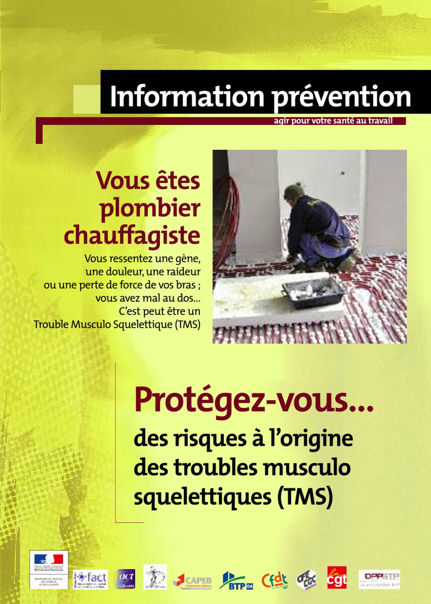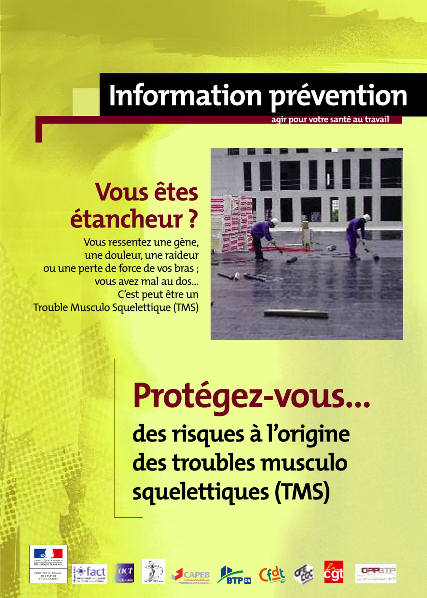 Télécharger nos 4 fiches TMS dans les métiers du BTP Protégez-vous... des risques à l'origine des troubles musculo squelettiques (TMS) (Novembre 2011) Chantiers du bâtiment : L'organisation du travail, un levier d'action pour la prévention des TMS (372.2 Ko) Vous êtes plombier chauffagiste ? (404.8 Ko) Vous êtes étancheur ? (430.4 Ko) Vous êtes maçon finisseur ? (385.9 Ko)