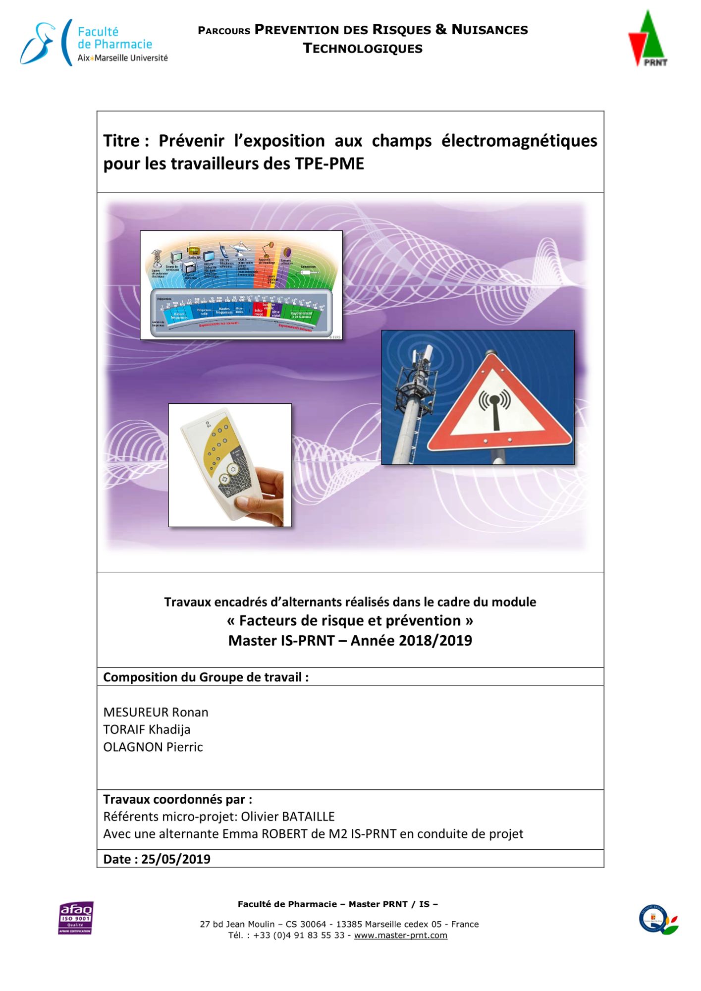 Le développement technologique des dernières décennies a incité l’Homme à mener de nombreuses études sur son exposition aux champs électromagnétiques (CEM). Malgré de nombreuses controverses beaucoup d’entre elles concluent à une possible dangerosité, bien que les effets à long terme soient encore mal connus. Dans une optique de prévention il est nécessaire que chaque travailleur ait connaissances de ces risques.