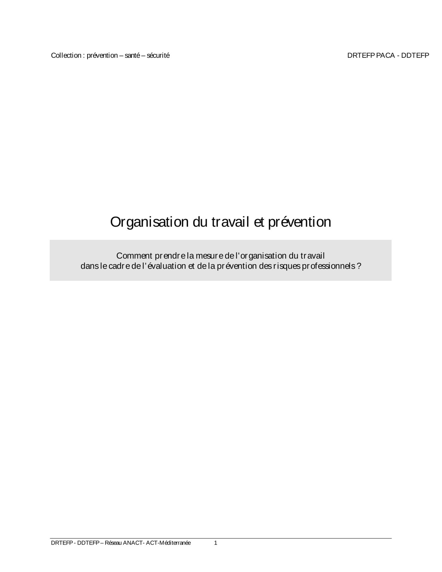 L’importance du sujet et la nécessité -pour progresser- de mieux s’approprier les différents aspects que revêt l’organisation du travail, sont des éléments qui ont motivé les représentants de l’Inspection du Travail, de la DRTEFP, de l’ANACT et d’ACT-Méditerranée à rédiger, ensemble, ce document.