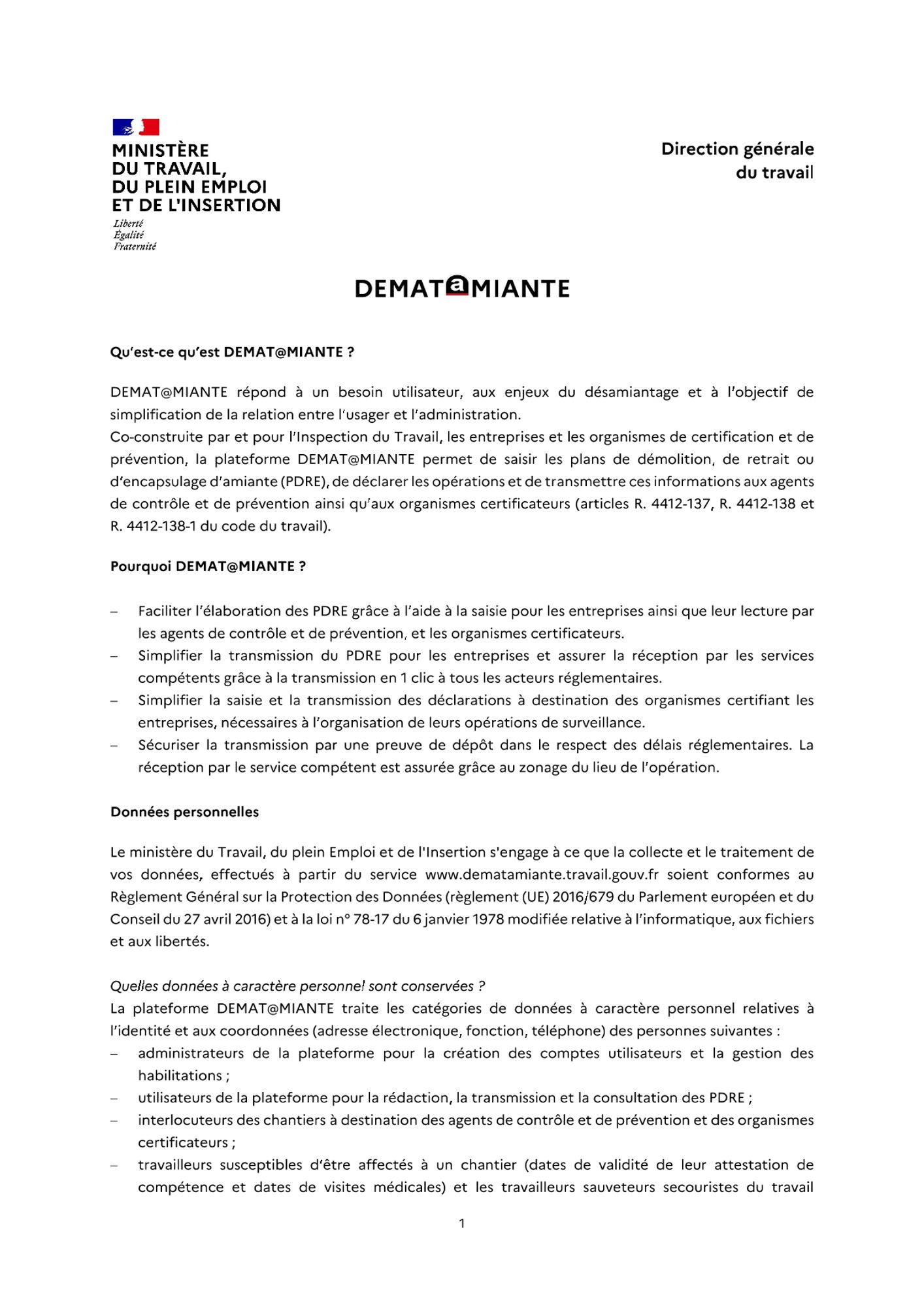 A compter de cette date, et pour toute nouvelle opération de traitement de l’amiante, les entreprises de désamiantage certifiées pour cette activité seront tenues d’établir et de transmettre leurs PDRE, avenants et informations sur les plannings de travaux via la plateforme DEMAT@MIANTE. L’envoi sur tout autre support (papier, CD-Rom, clé USB etc.) ne sera plus accepté.