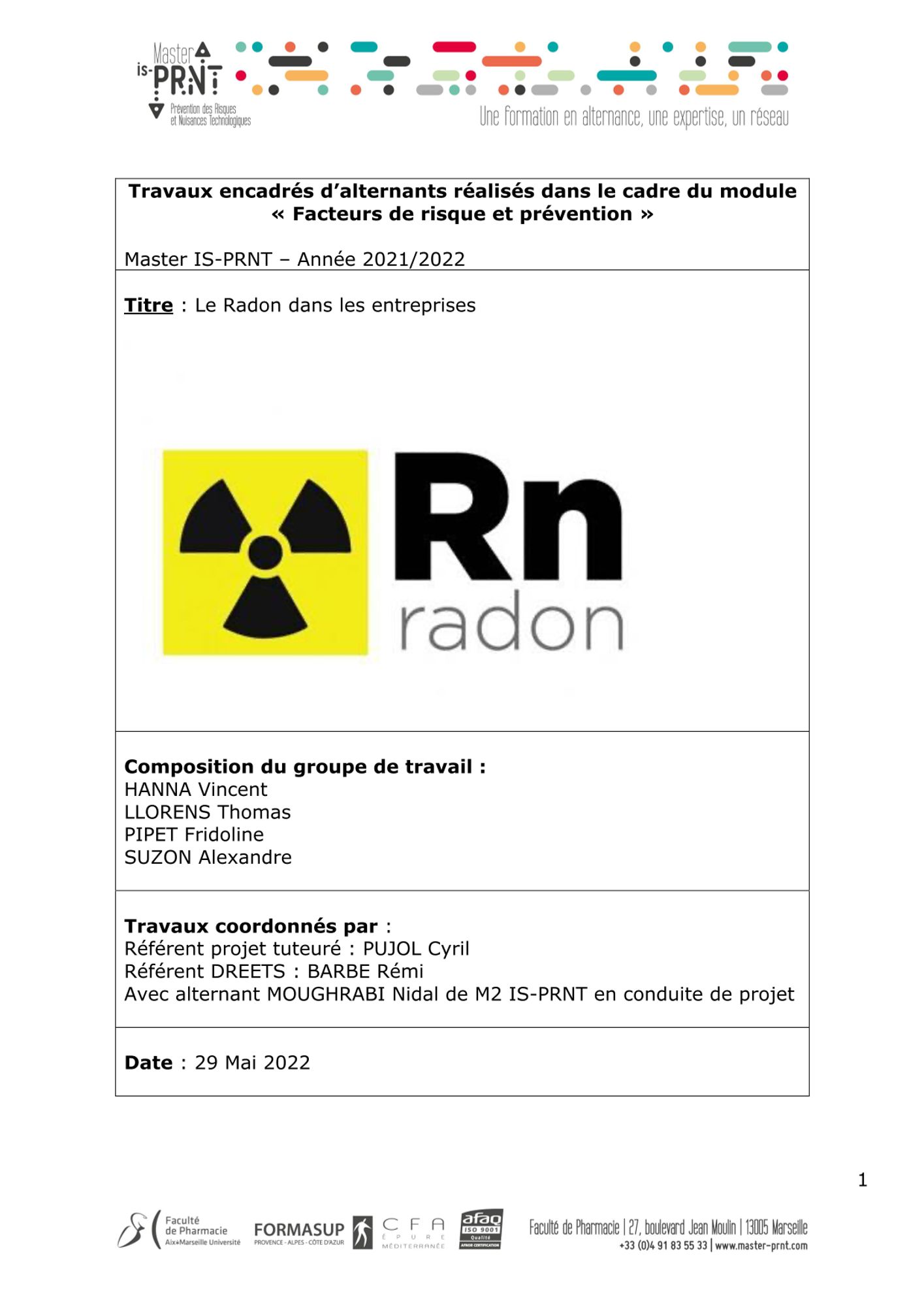 Ce gaz étant reconnu comme un cancérigène certain pour l’Homme, il se doit d’être connu et identifié dans les démarches d’évaluations des risques professionnels par l’employeur, lorsque ce gaz radioactif s’accumule dans un lieu de travail.