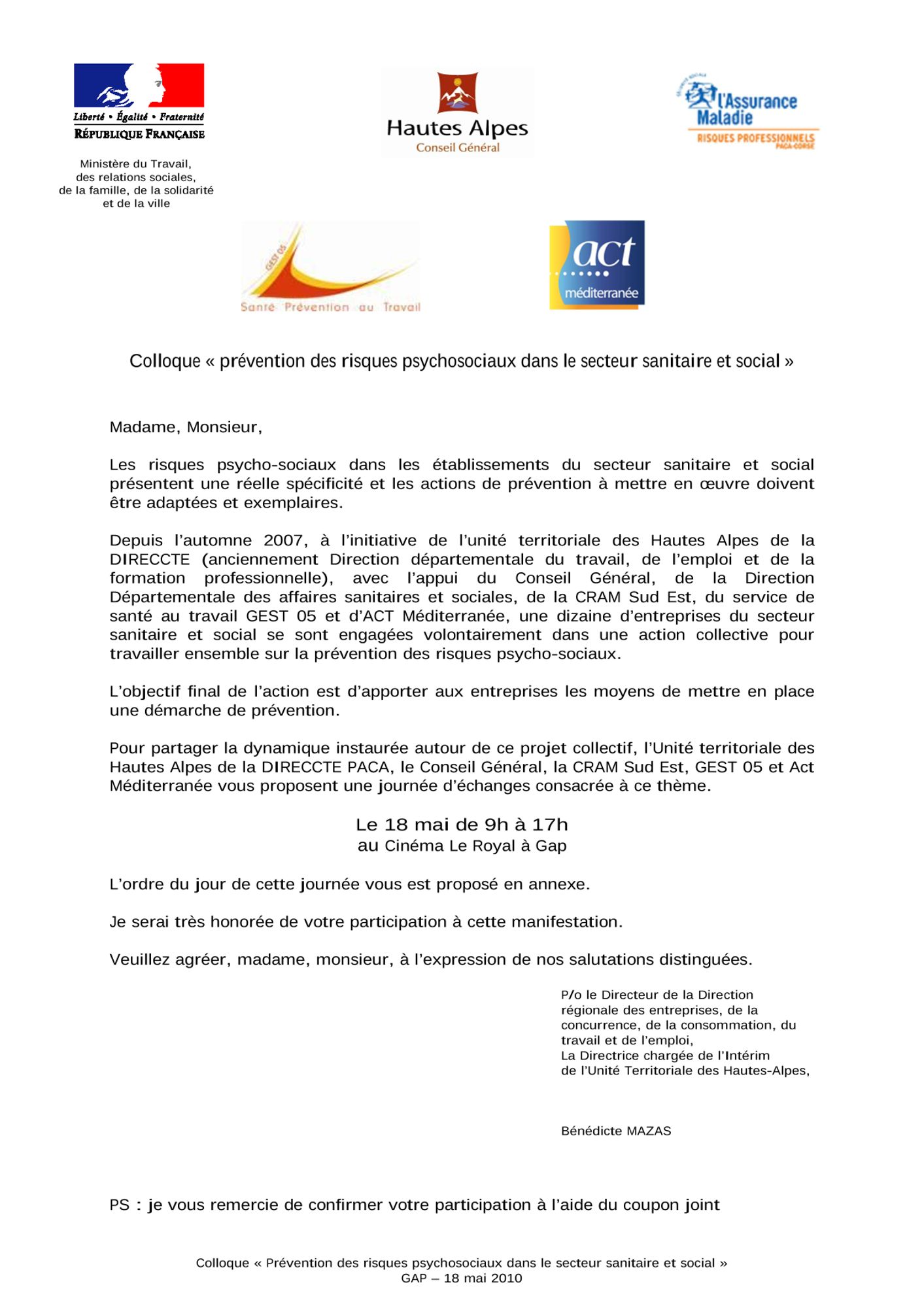Prévention des risques psychosociaux dans le secteur sanitaire et social - Colloque de Gap du 18 mai 2010