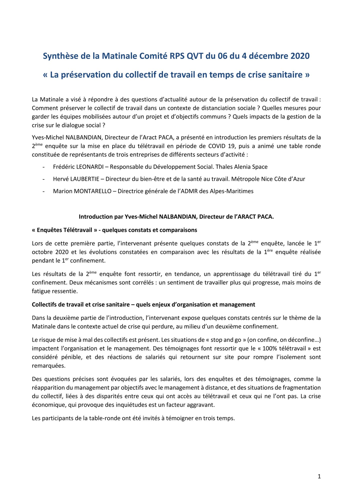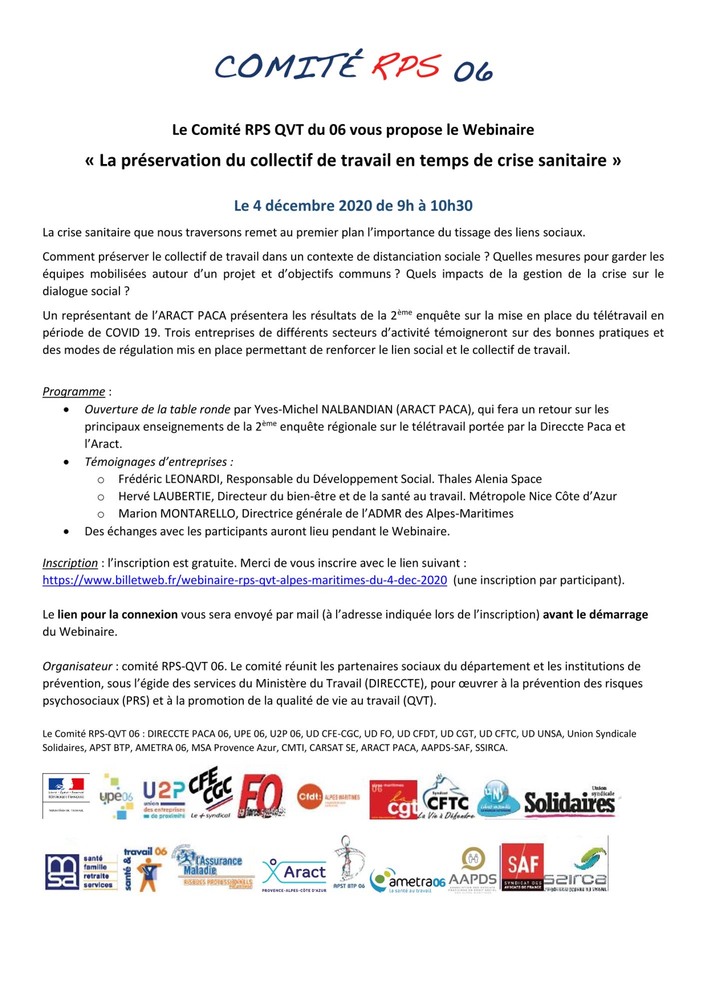 Un représentant de l’ARACT PACA présentera les résultats de la 2ème enquête sur la mise en place du télétravail en période de COVID 19. Trois entreprises de différents secteurs d’activité témoigneront sur des bonnes pratiques et des modes de régulation mis en place permettant de renforcer le lien social et le collectif de travail.