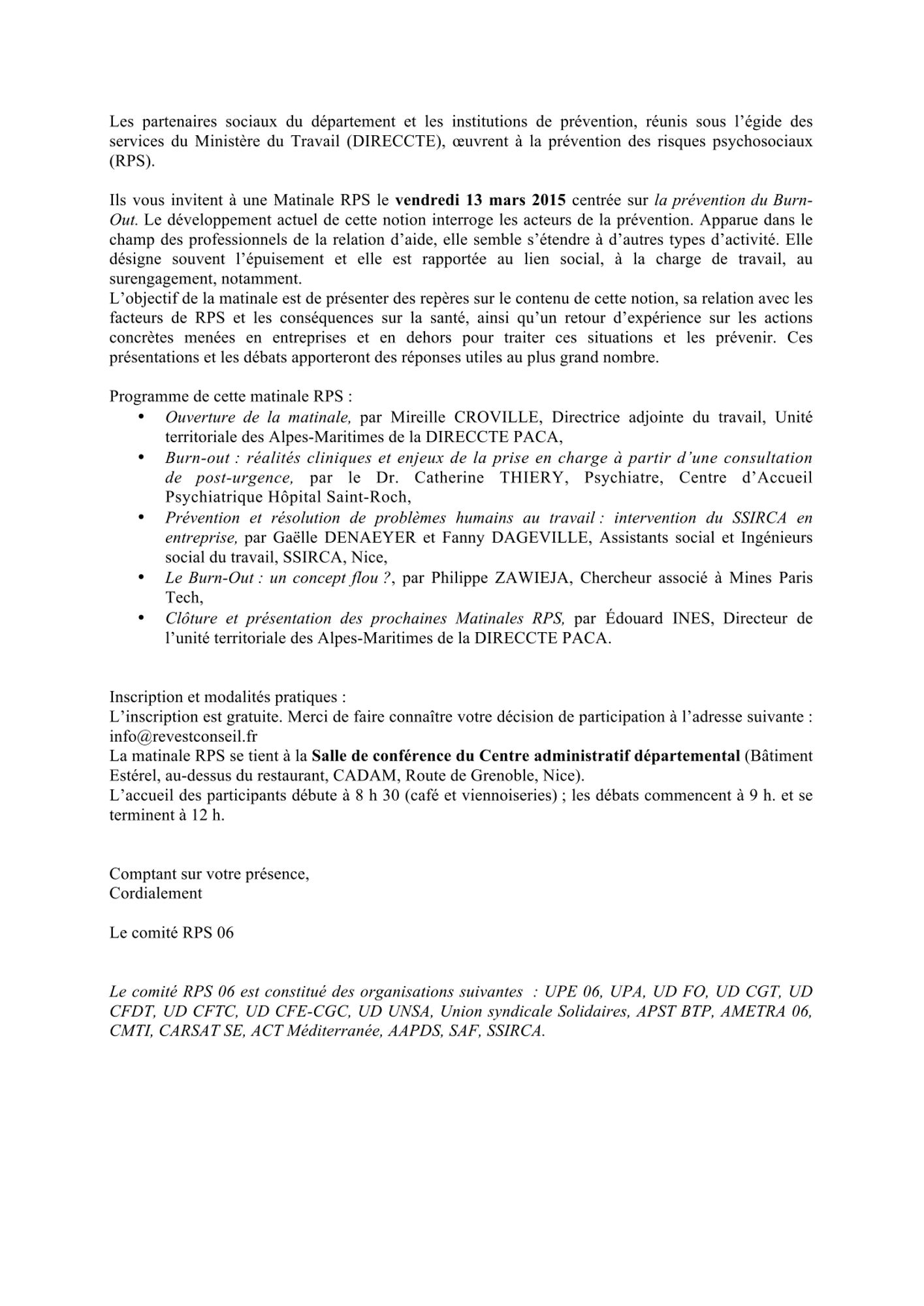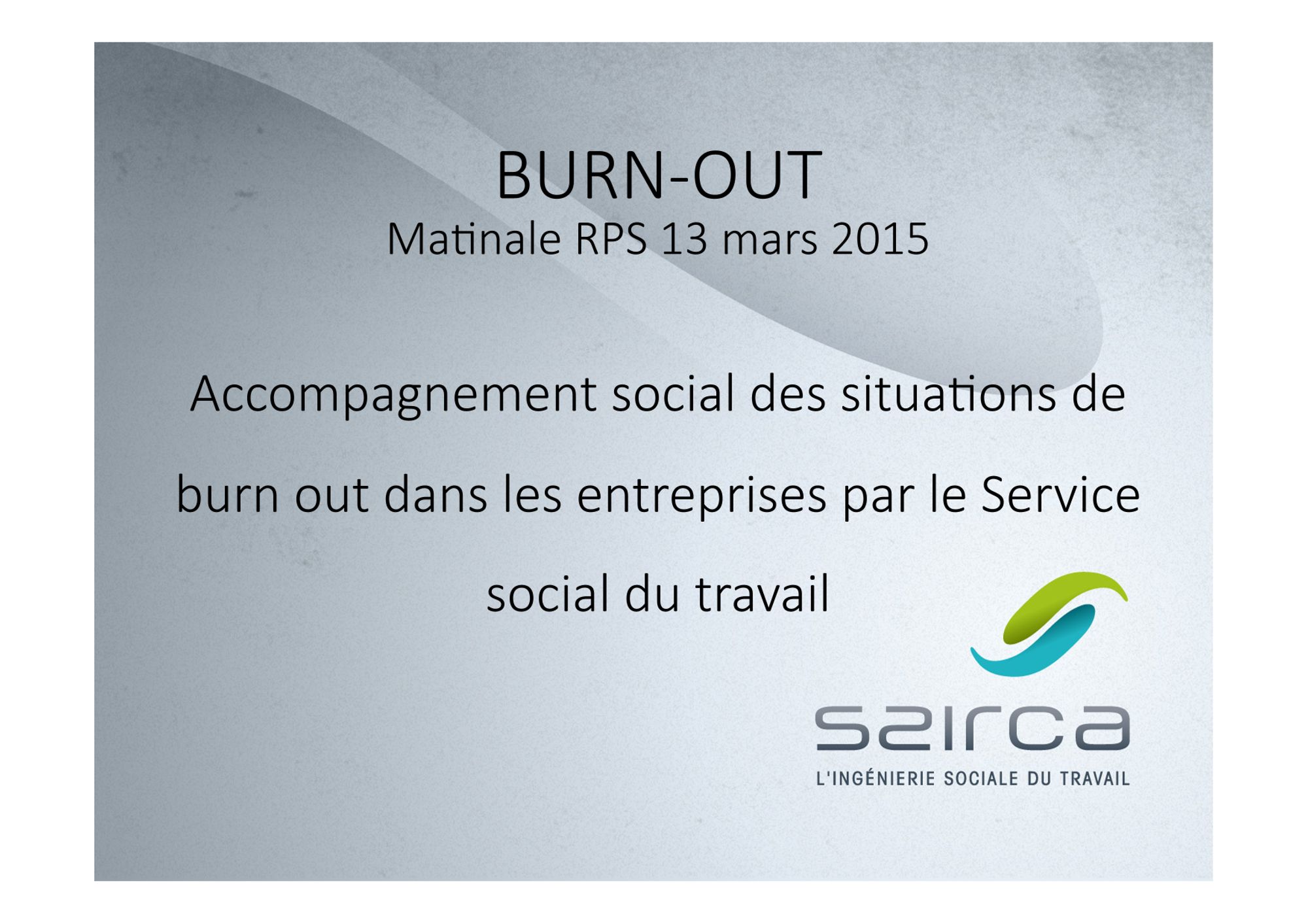 La prévention du Burn-Out 13 mars 2015 Invitation (100.0 Ko) Burn-out : Réalités cliniques et enjeux de la prise en charge (Dr Catherine Thiery) (153.3 Ko) Accompagnement social des situations de burn-out dans les entreprises (SSIRCA) (1.1 Mo) Burn-out : un concept flou ? (Philippe Zawieja) (434.6 Ko)