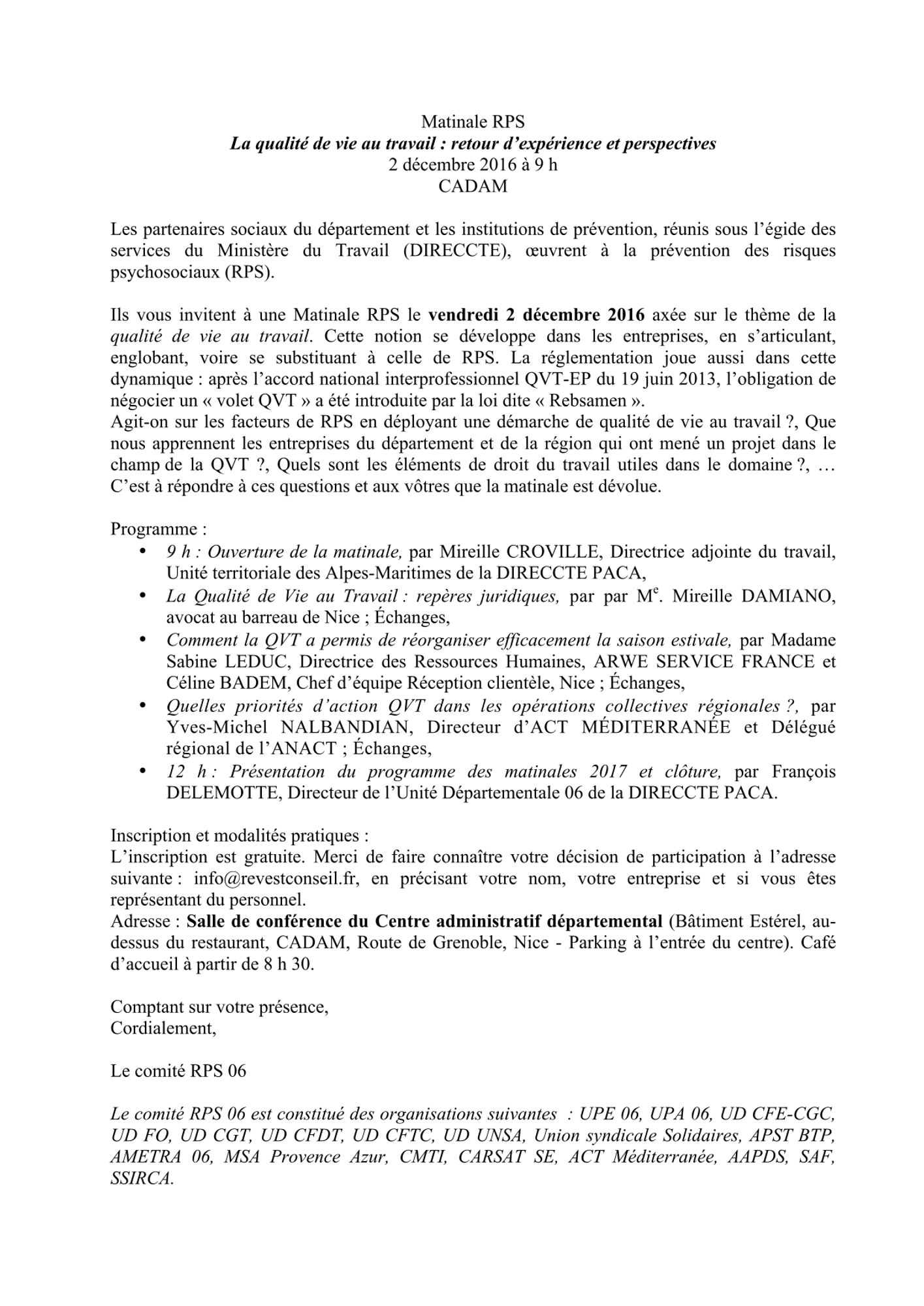La qualité de vie au travail : retour d'expérience et perspectives 2 décembre 2016 Invitation (107.2 Ko) Quelles priorités d'actions QVT ? (6.6 Mo) Atelier QVT (897.0 Ko)