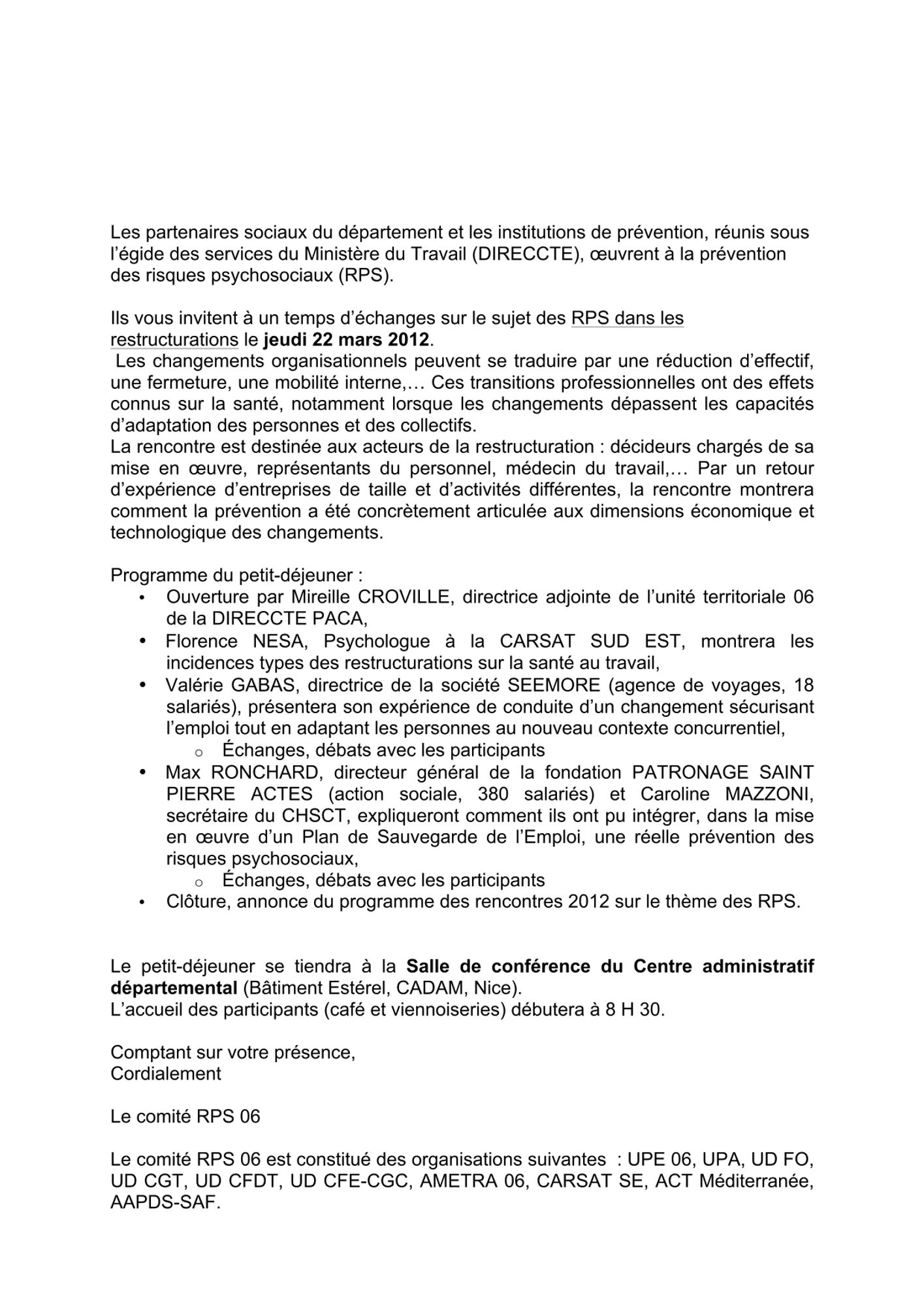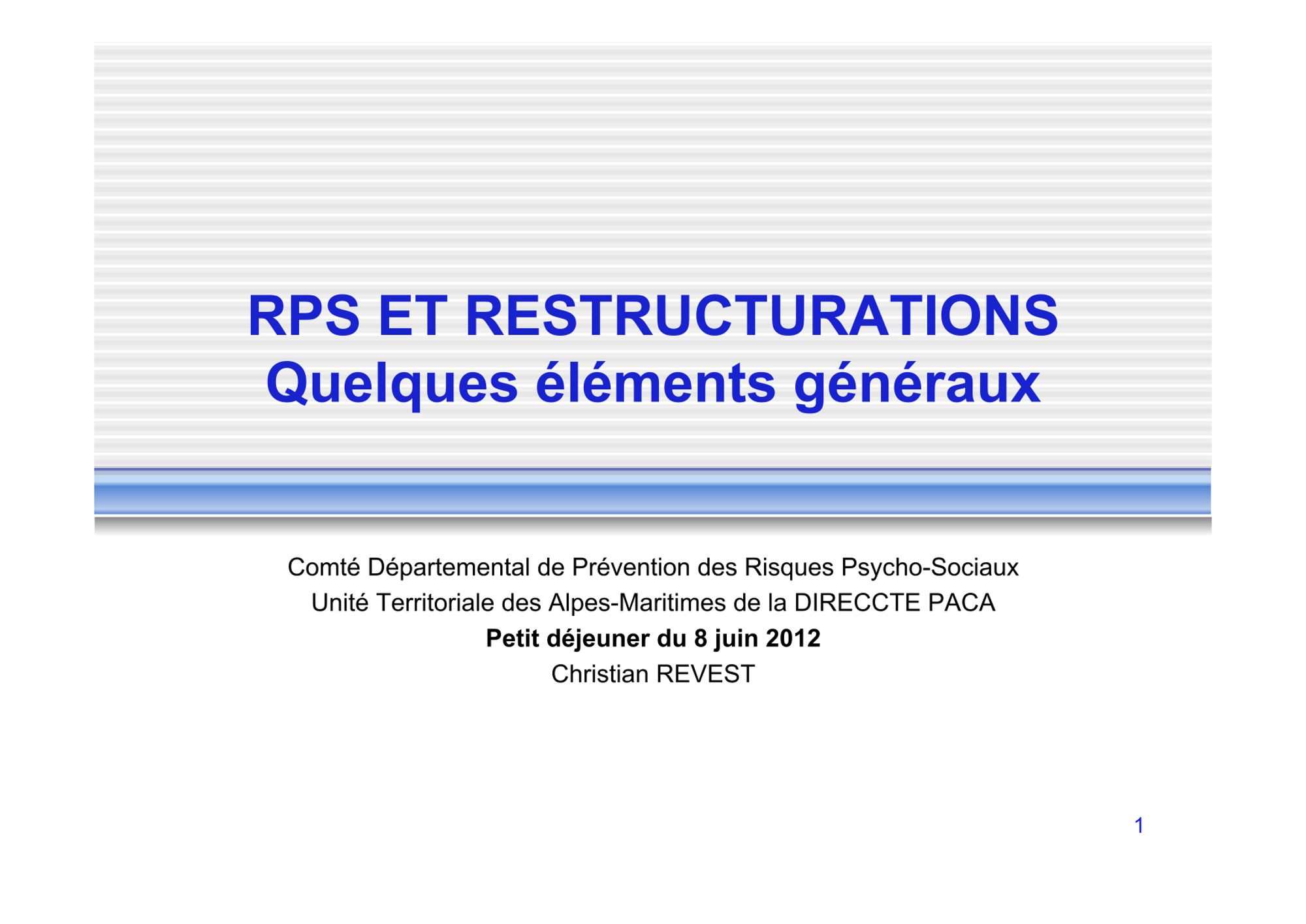 Les RPS dans les restructurations 22 mars et 8 juin 2012 Programme du 22/03/12 (58.8 Ko) Programme du 08/06/12 (48.0 Ko) Conséquences sur la santé des RPS (cabinet de consultant) (157.5 Ko)