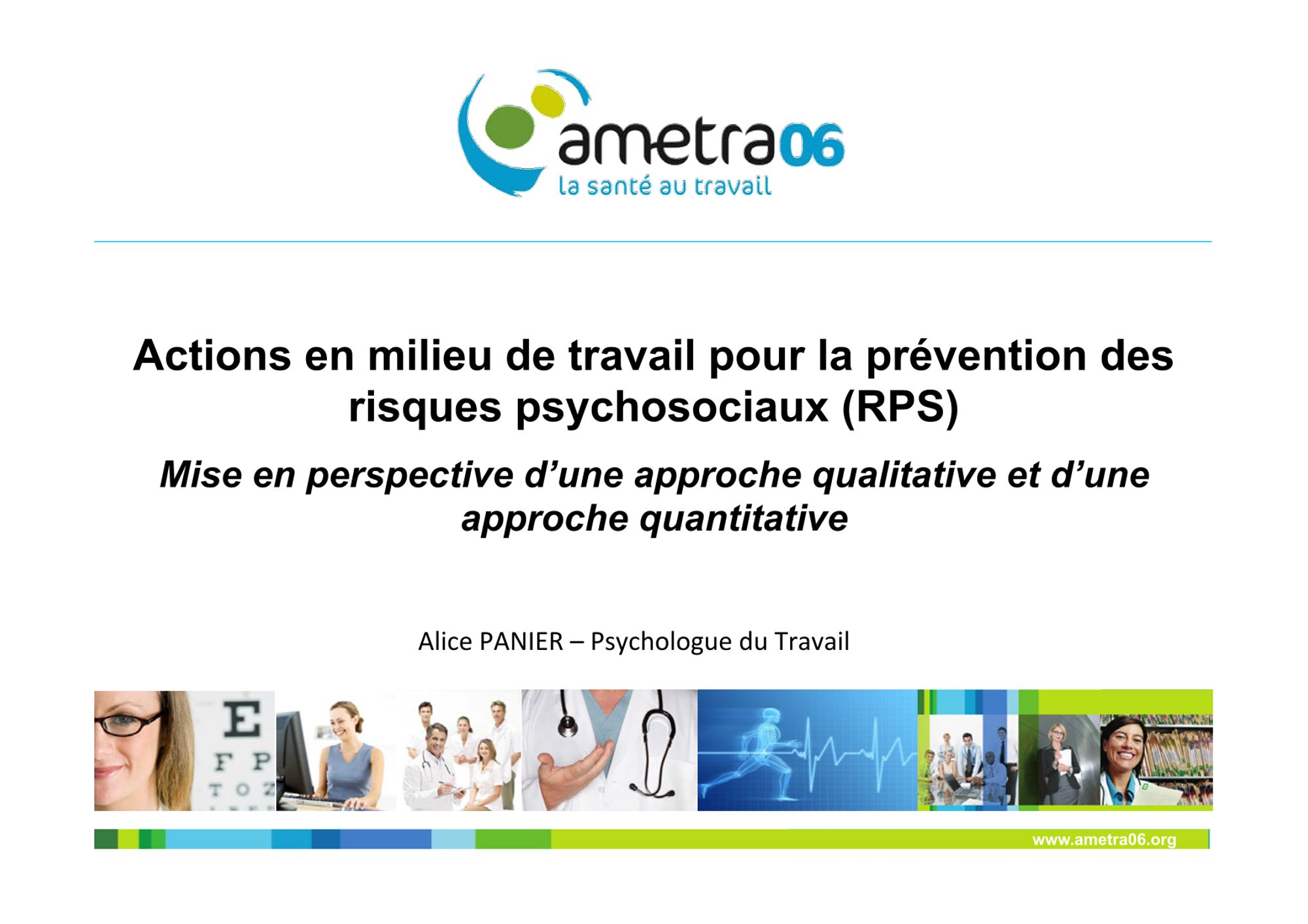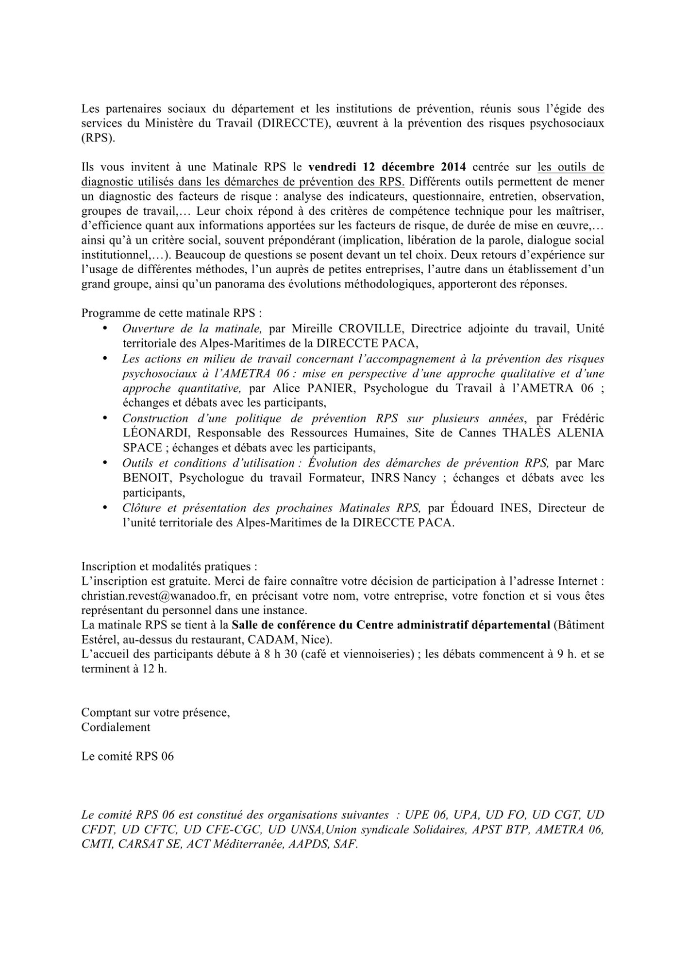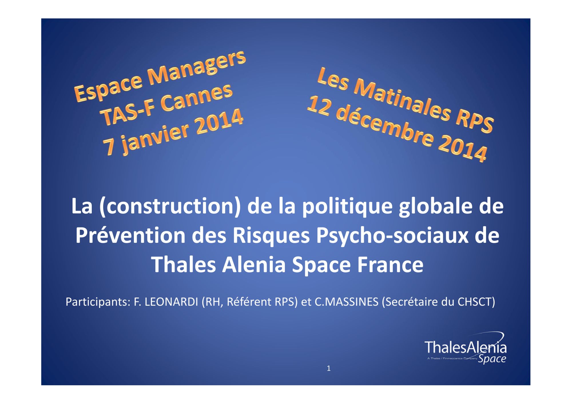 Méthodologies comparées en matière de RPS 12 décembre 2014 Programme de la matinée (99.1 Ko) Actions en milieu de travail pour la prévention des risques psychosociaux (RPS) - Mise en perspective d'une approche qualitative et d'une approche quantitative (268.7 Ko) Outils et conditions d'utilisation : Évolution des démarches de prévention des RPS (515.3 Ko) La (construction) de la politique globale de Prévention des Risques Psycho-sociaux de Thales Alenia Space France (805.3 Ko)