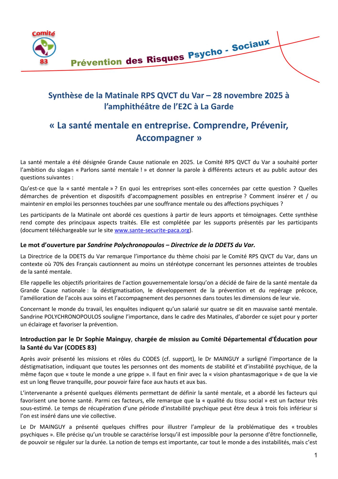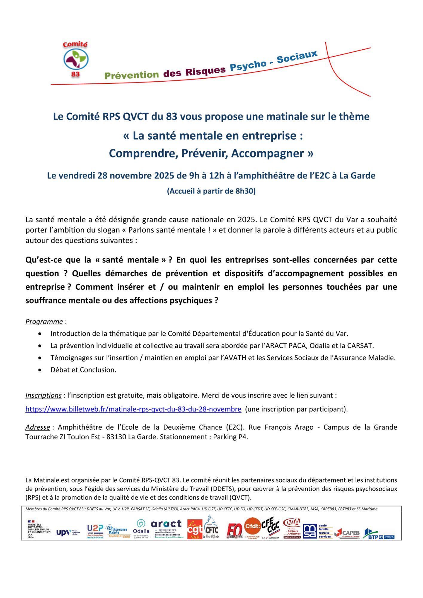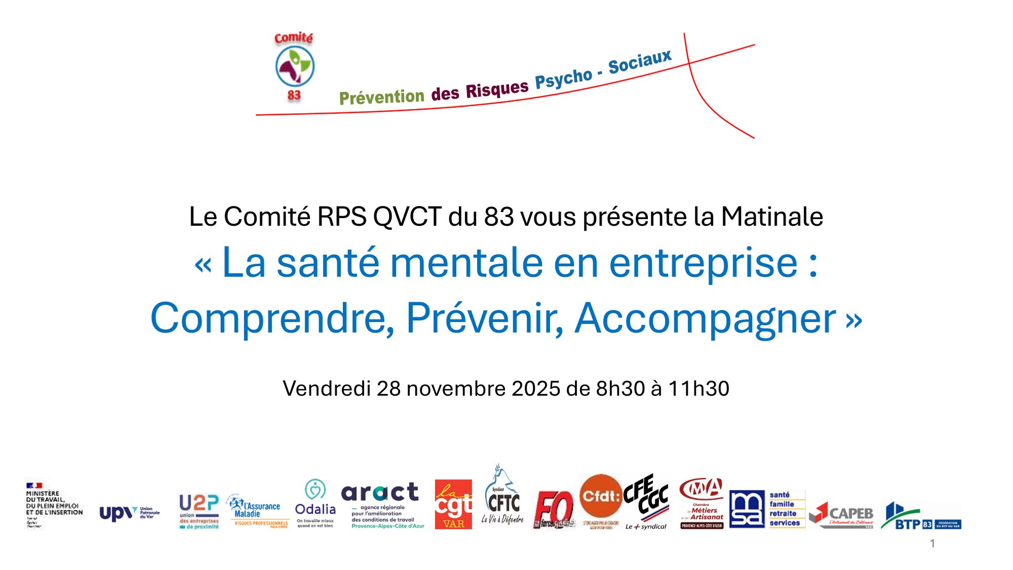 Le Comité RPS QVCT du Var a souhaité porter l’ambition du slogan «Parlons santé mentale ! » et donner la parole à différents acteurs et au public autour des questions suivantes :