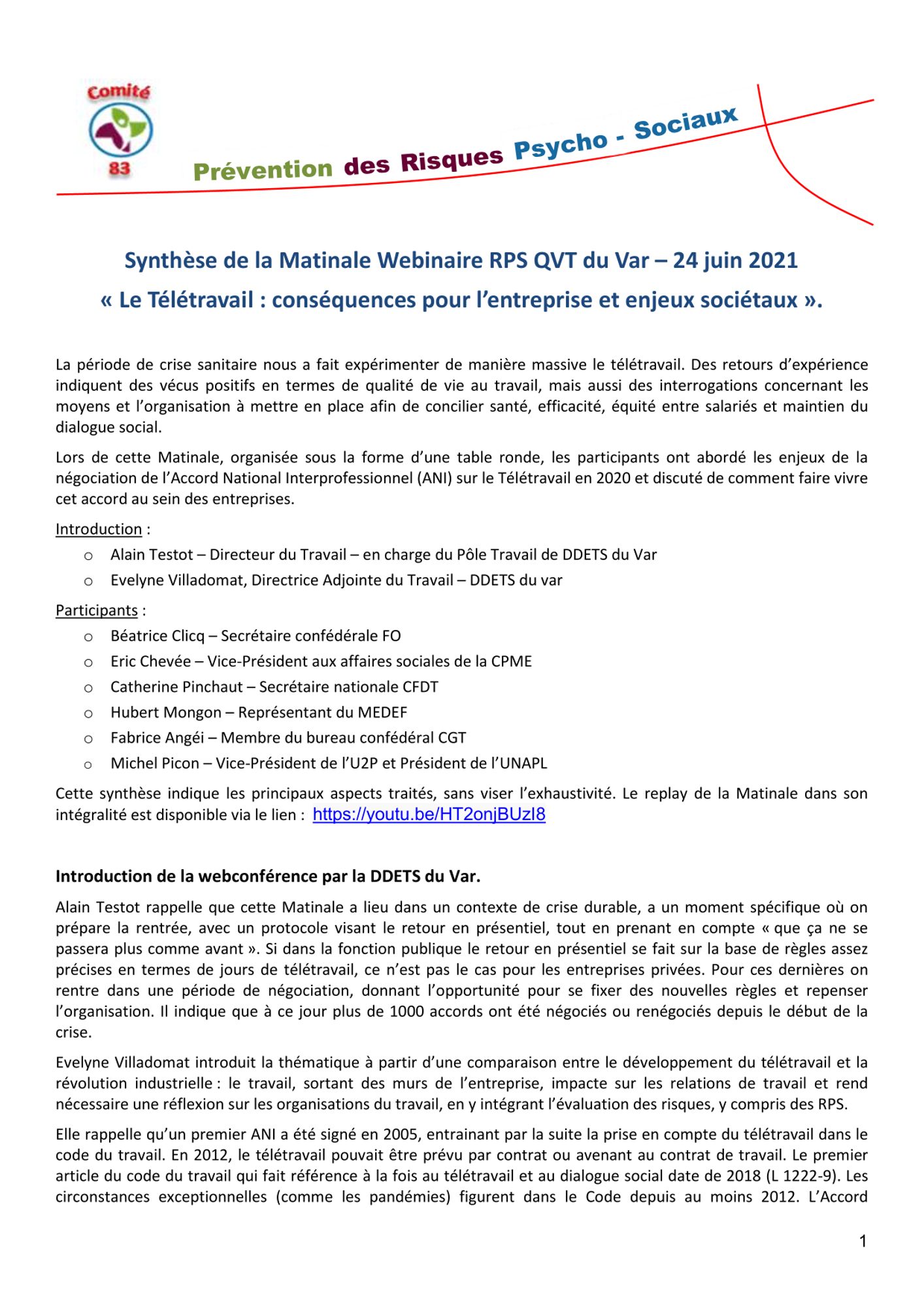 La période de crise sanitaire nous a fait expérimenter de manière massive le télétravail. Des retours d’expérience indiquent des vécus positifs en termes de qualité de vie au travail, mais aussi des interrogations concernant les moyens et l’organisation à mettre en place afin de concilier santé, efficacité, équité entre salariés et maintien du dialogue social.
