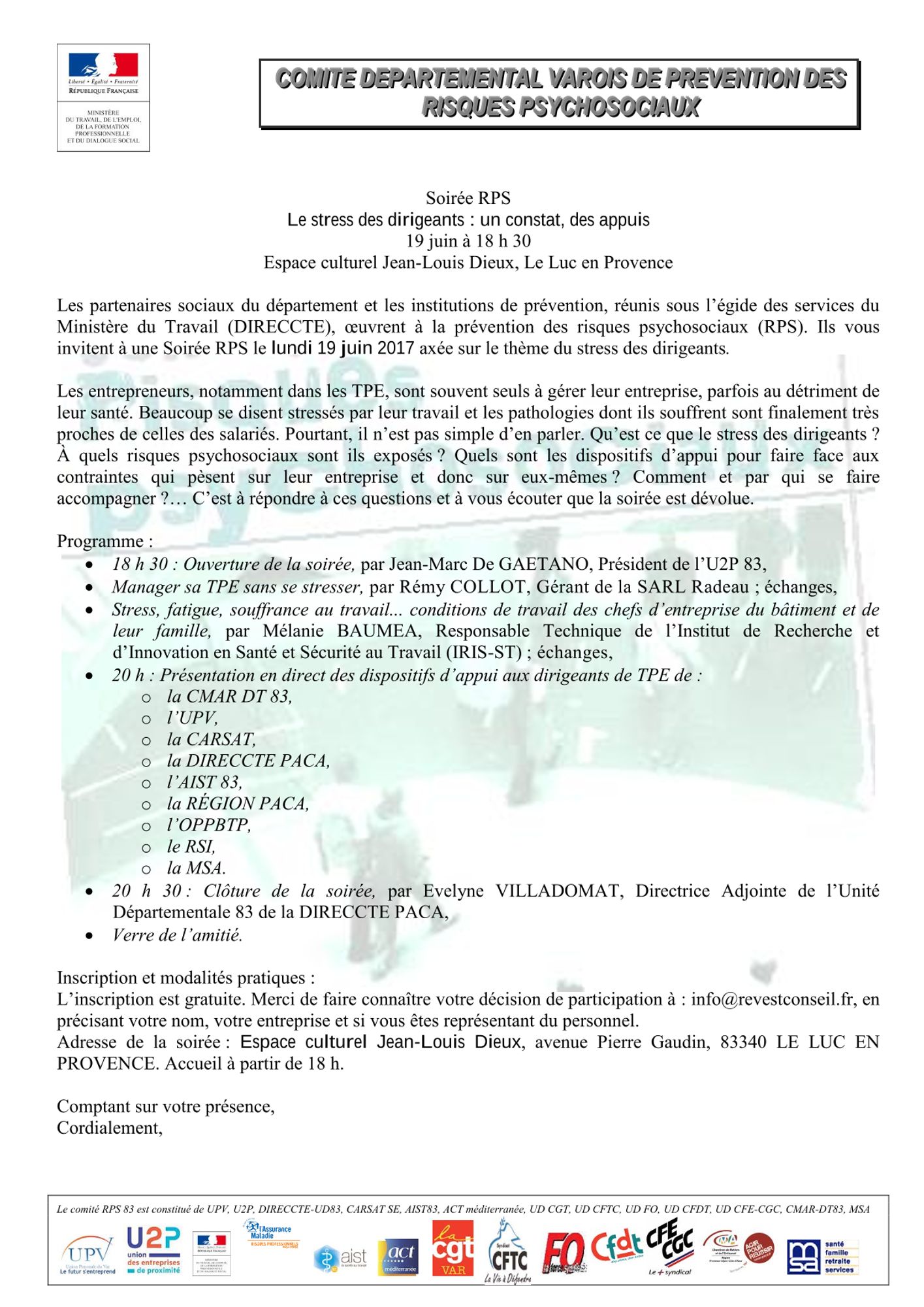 Soirée à destination des dirigeants artisans : le Stress des Dirigeants 19 juin 2017 Invitation (452.2 Ko) Présentation (1.5 Mo)