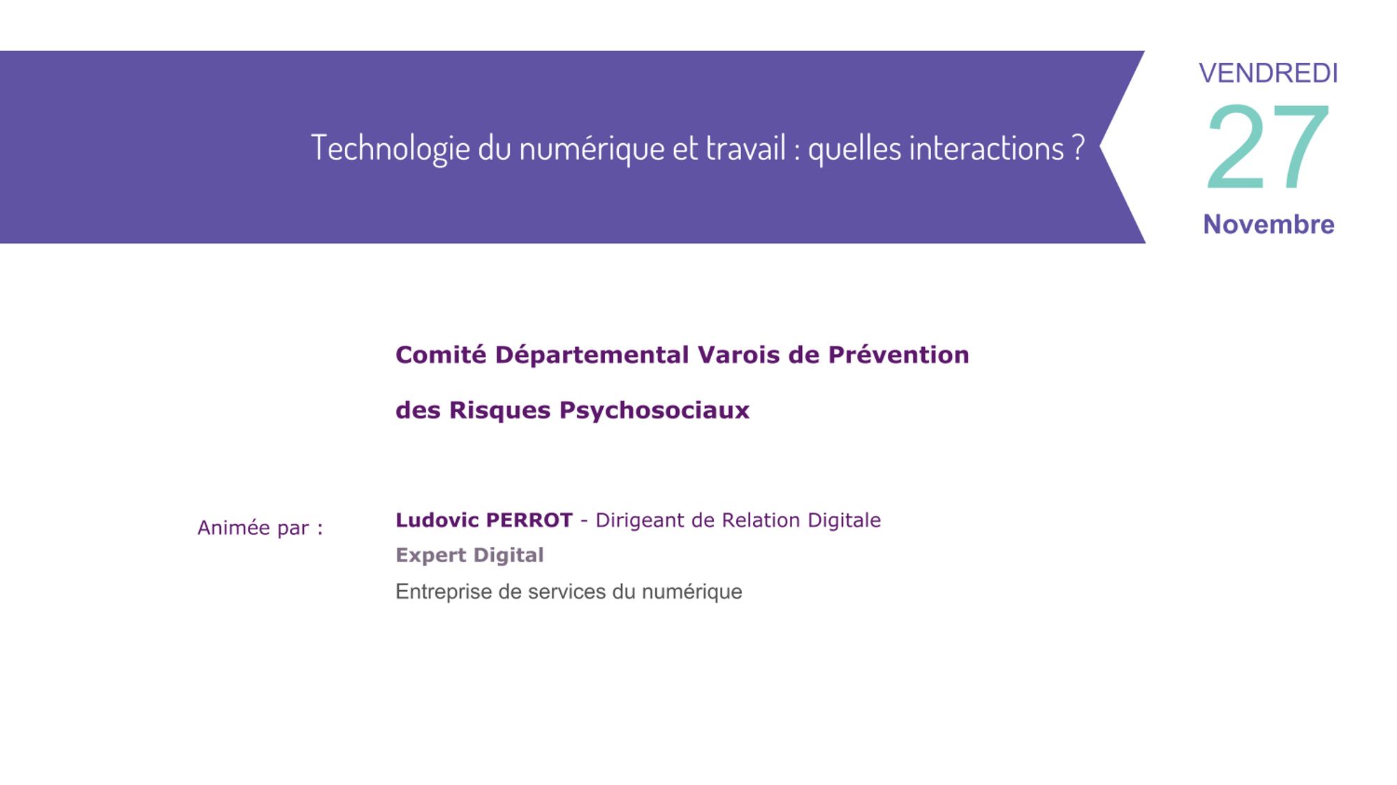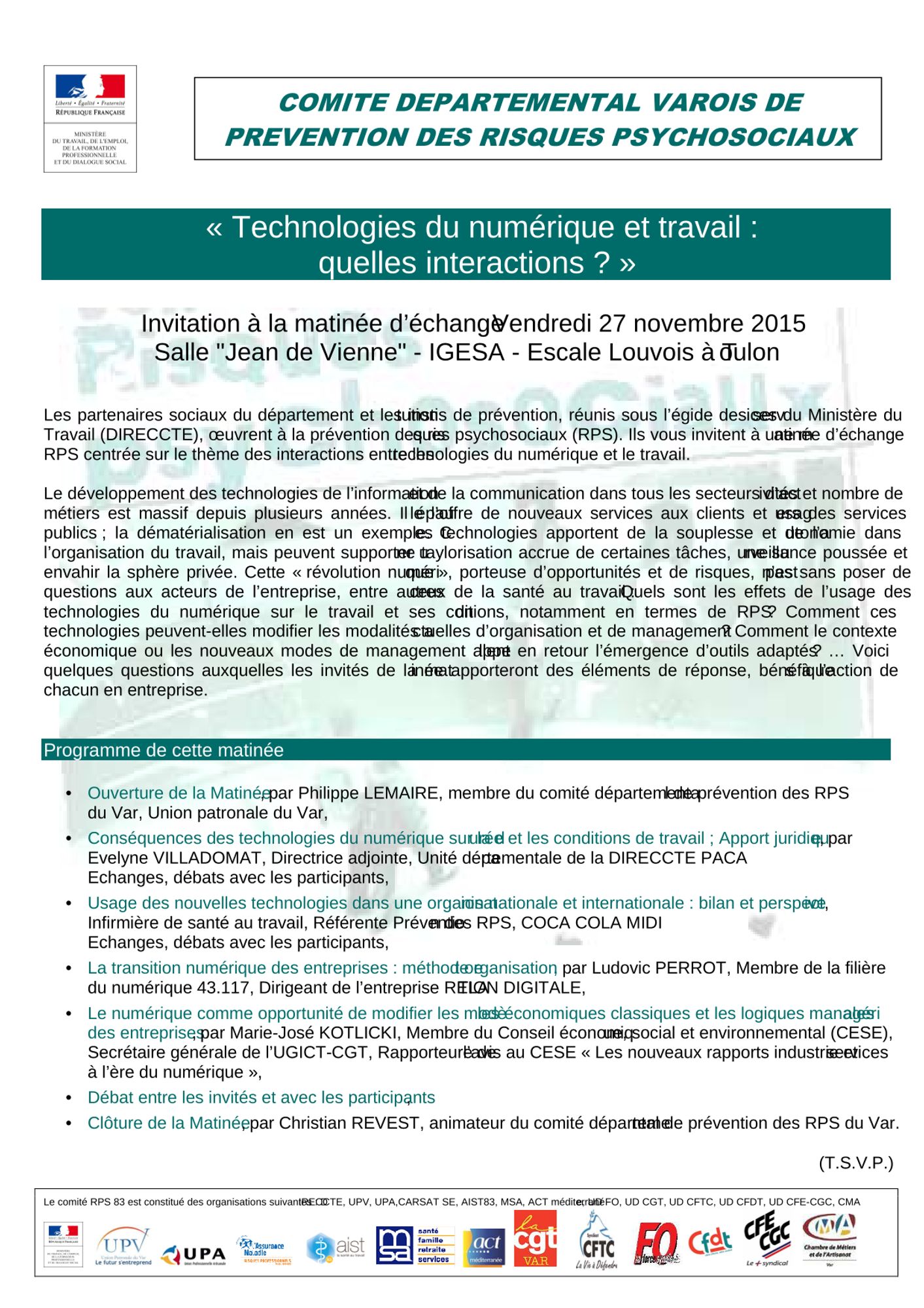 Technologies du numérique et travail : Quelles interactions ? 27 novembre 2015 Programme (549.1 Ko) Présentation (1.6 Mo) Technologie du numérique et travail : quelles interactions ? (Entreprise de service du numérique) (888.3 Ko)