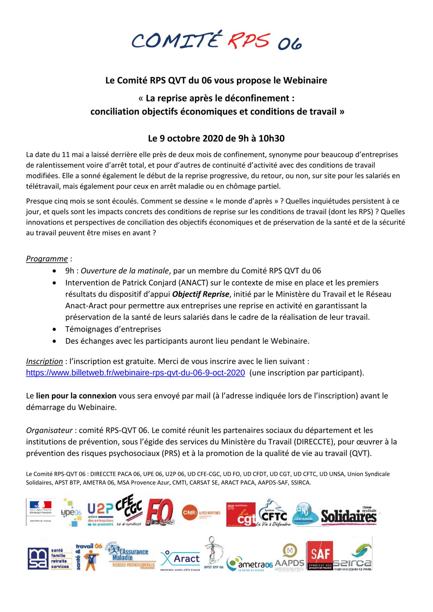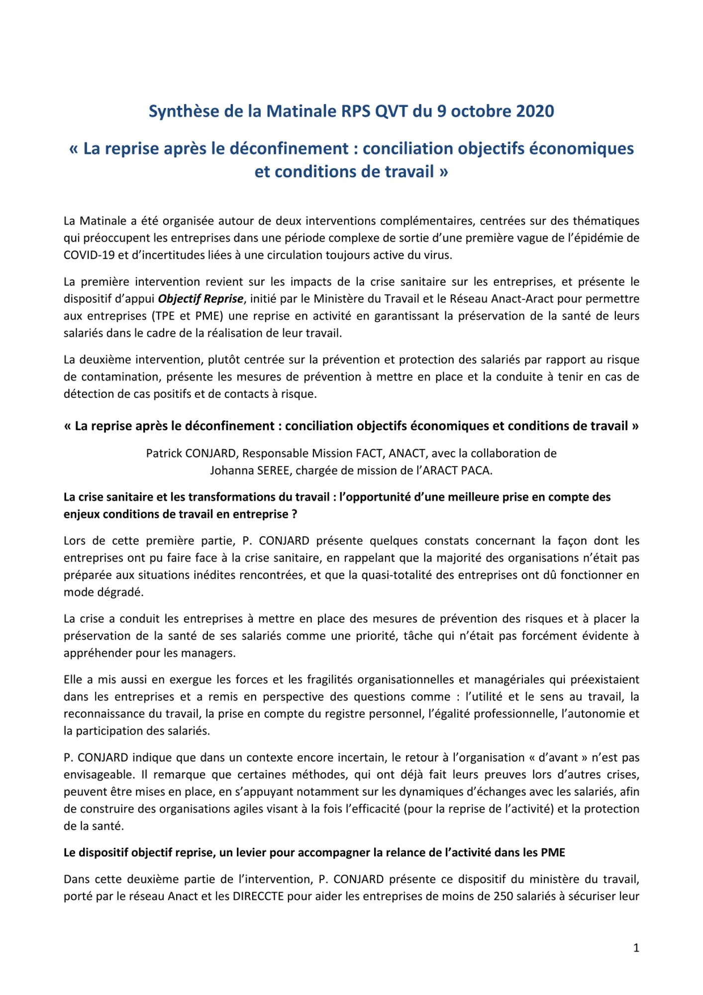 Presque cinq mois se sont écoulés. Comment se dessine « le monde d’après » ? Quelles inquiétudes persistent à ce jour, et quels sont les impacts concrets des conditions de reprise sur les conditions de travail (dont les RPS) ? Quelles innovations et perspectives de conciliation des objectifs économiques et de préservation de la santé et de la sécurité au travail peuvent être mises en avant ?