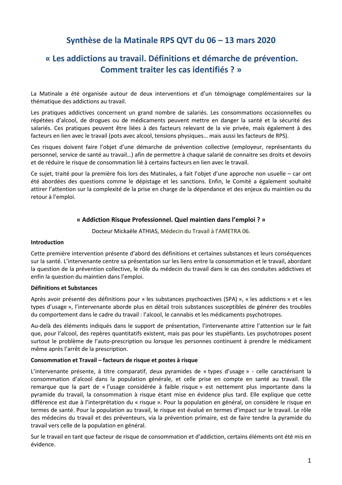 Les addictions au travail. Définitions et démarche de prévention. Comment traiter les cas identifiés ?