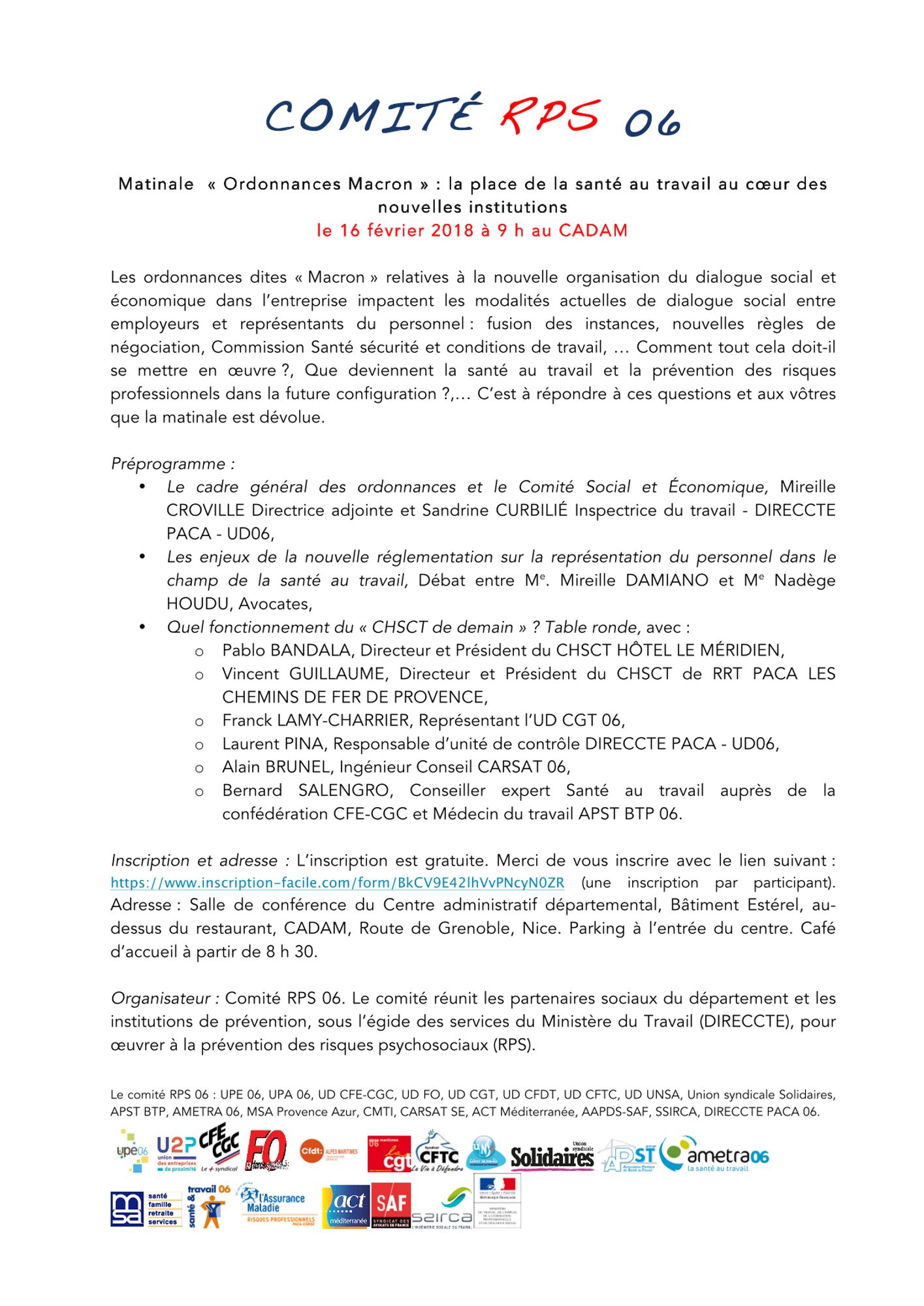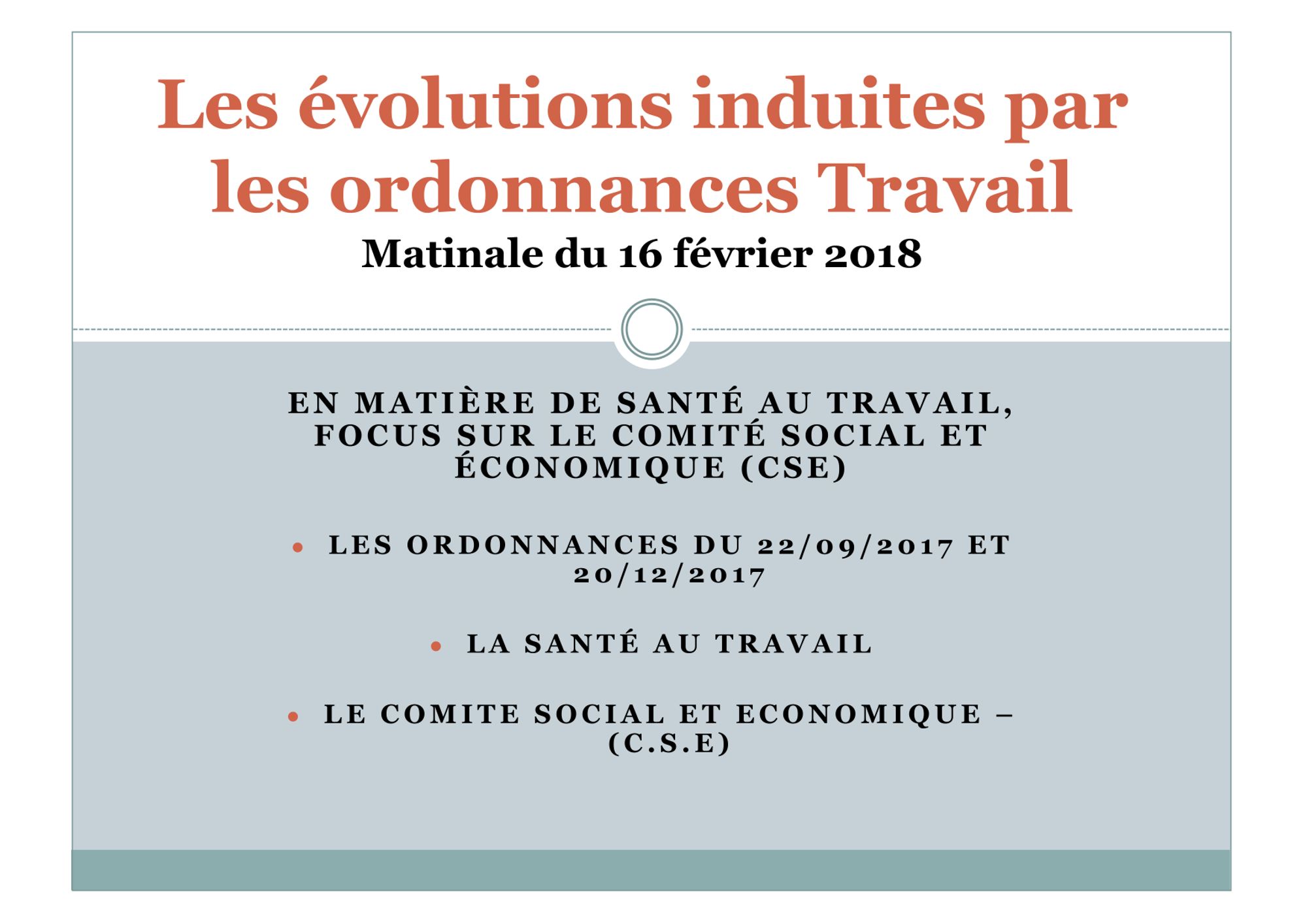 "Ordonnances Macron" : la place de la santé au travail au coeur des nouvelles institutions 16 février 2018 Invitation (342.1 Ko) Les évolutions induites par les ordonnances Travail (671.8 Ko) La compétence du comité social et économique (392.9 Ko)
