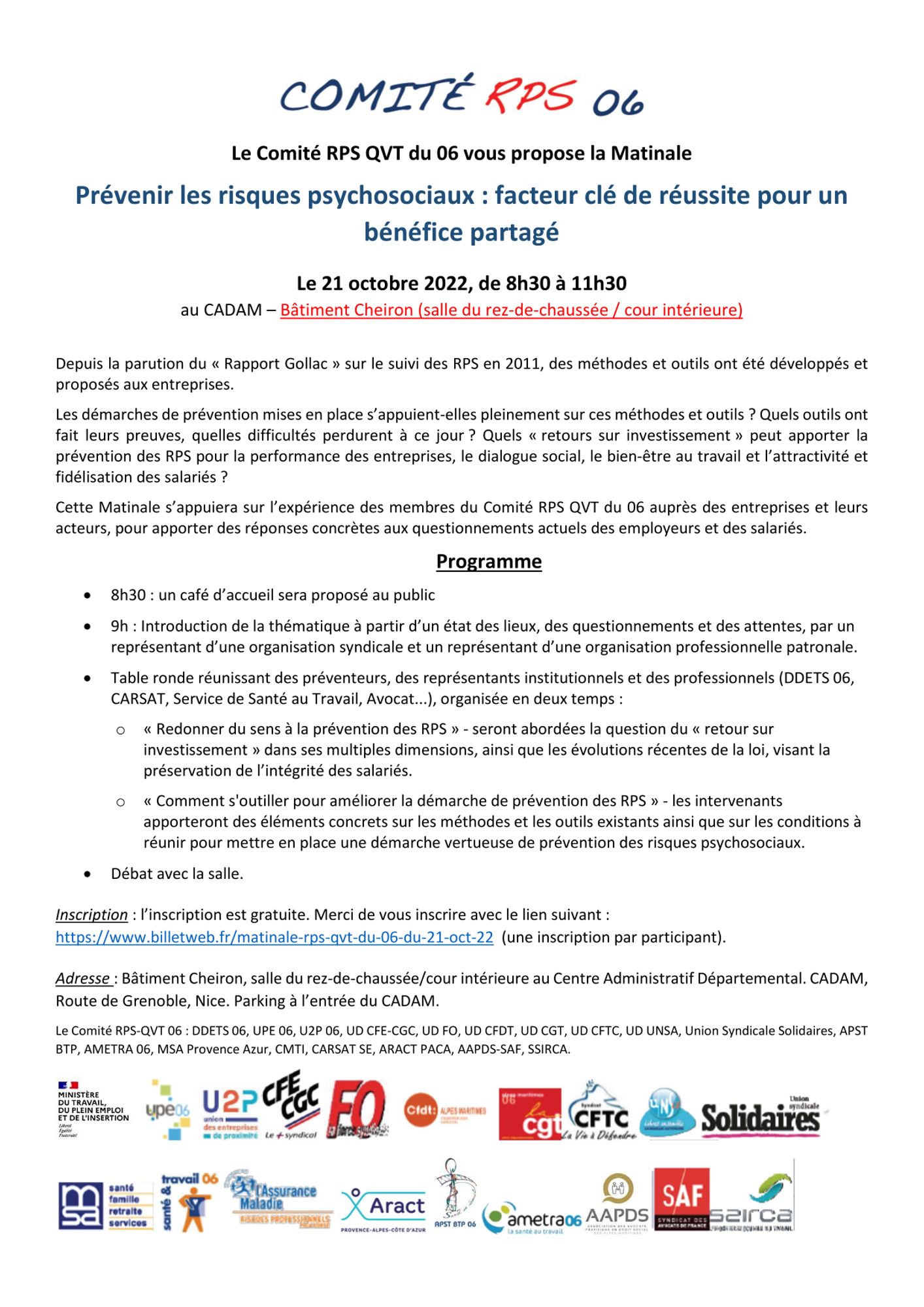 Inscription gratuite : Matinale RPS QVT du 06 du 21 octobre 2022 - Billetweb (une inscription par participant).
