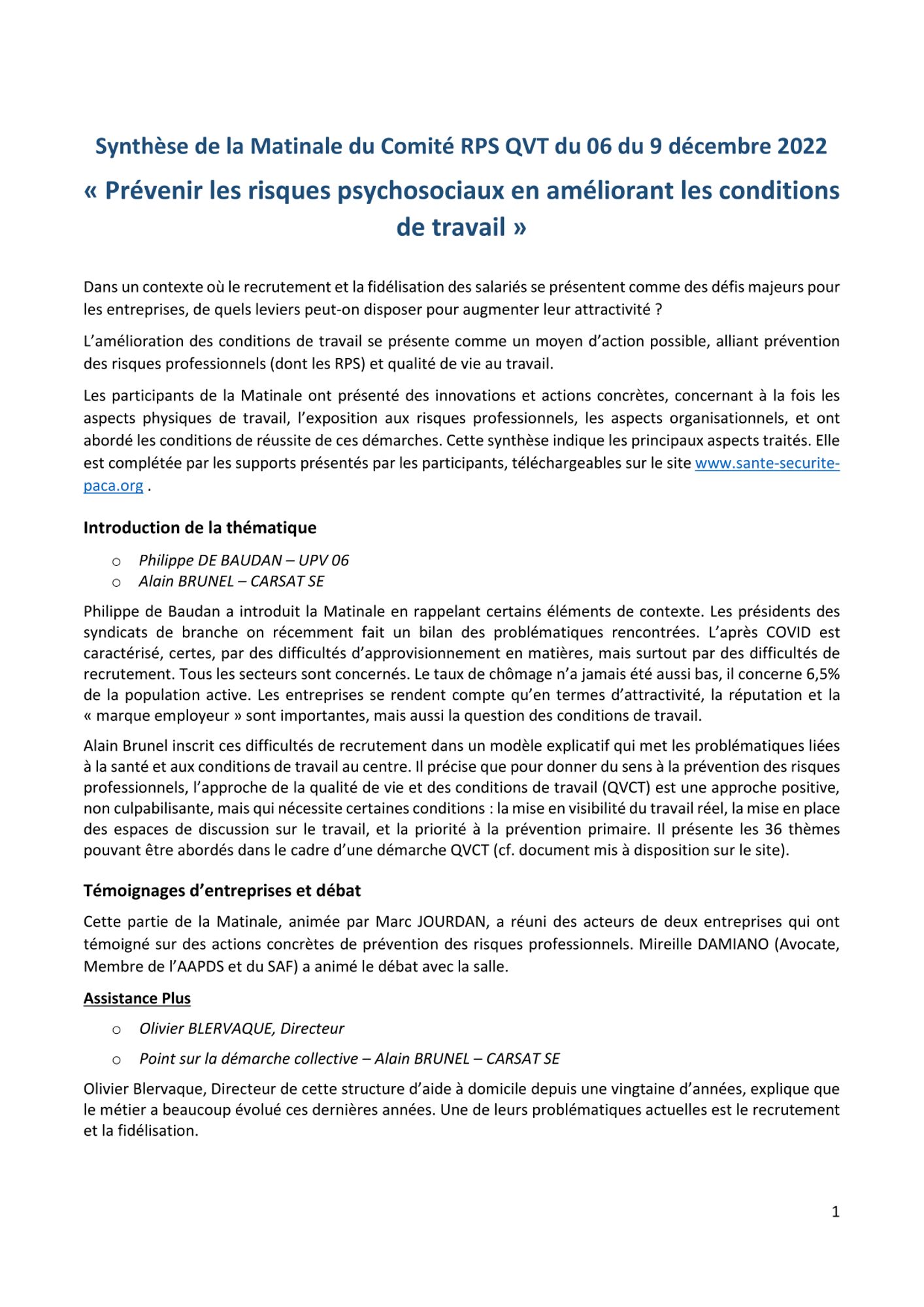 L’amélioration des conditions de travail se présente comme un moyen d’action possible, alliant prévention des risques professionnels (dont les RPS) et qualité de vie au travail.