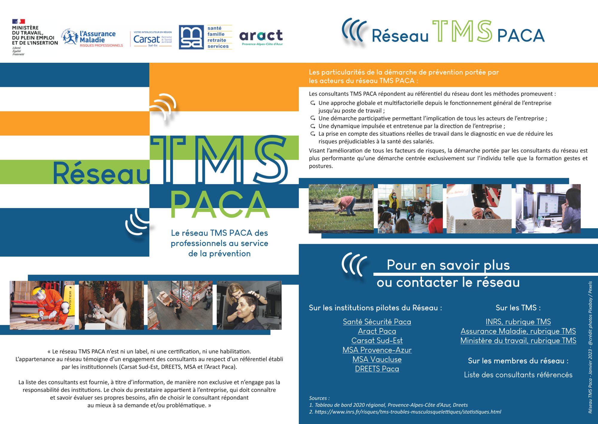 Le réseau "TMS PACA" est un réseau de consultants de la région PACA intervenant sur le champ de la prévention des Troubles MusculoSquelettiques. Ces consultants s'engagent dans la mise en œuvre de bonnes pratiques de prévention, sur la base d'un référentiel qui répond à une démarche complète de prévention établie par la DREETS PACA, la Carsat Sud-Est, la MSA Provence Azur, la MSA Alpes Vaucluse et l'ARACT.