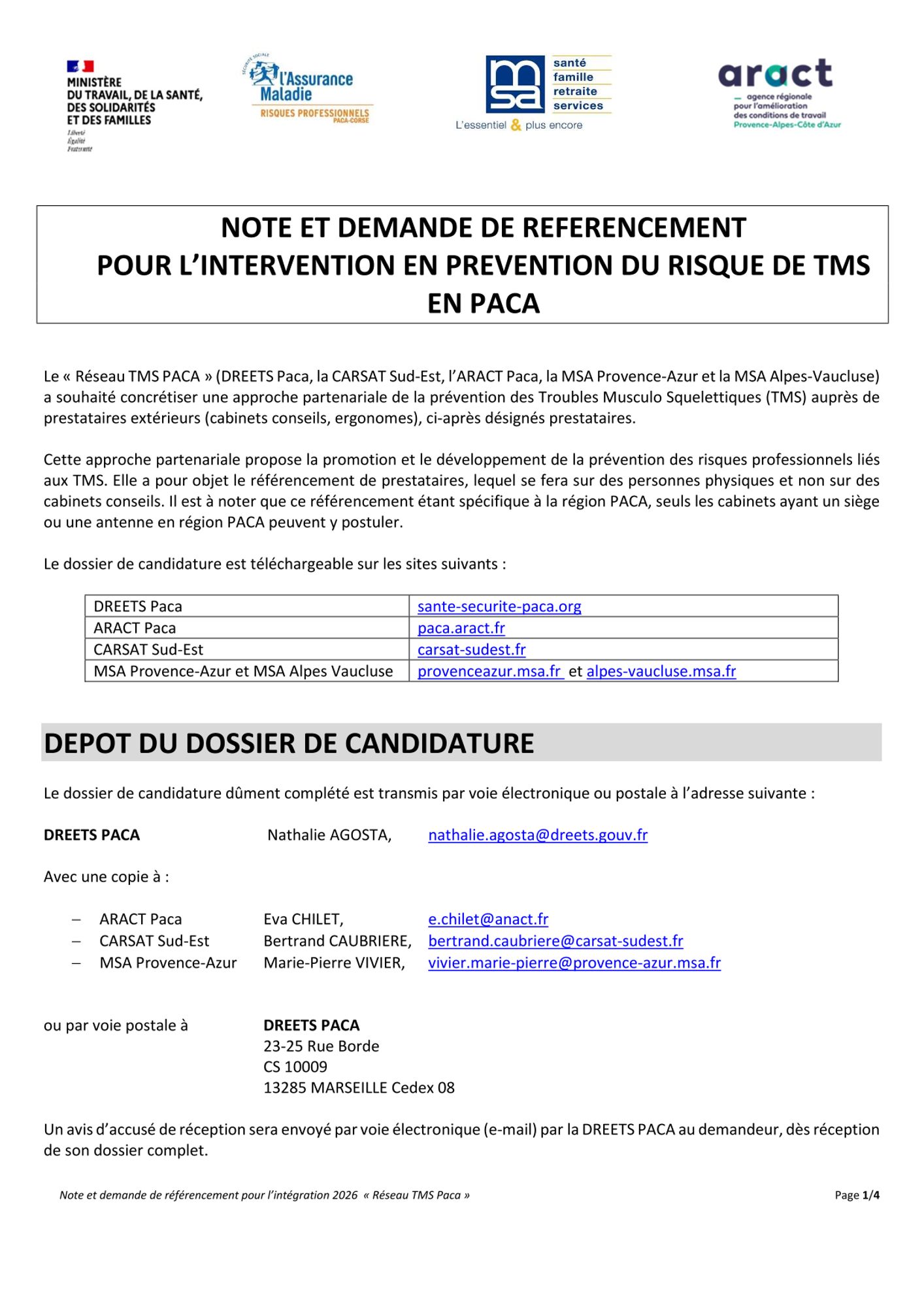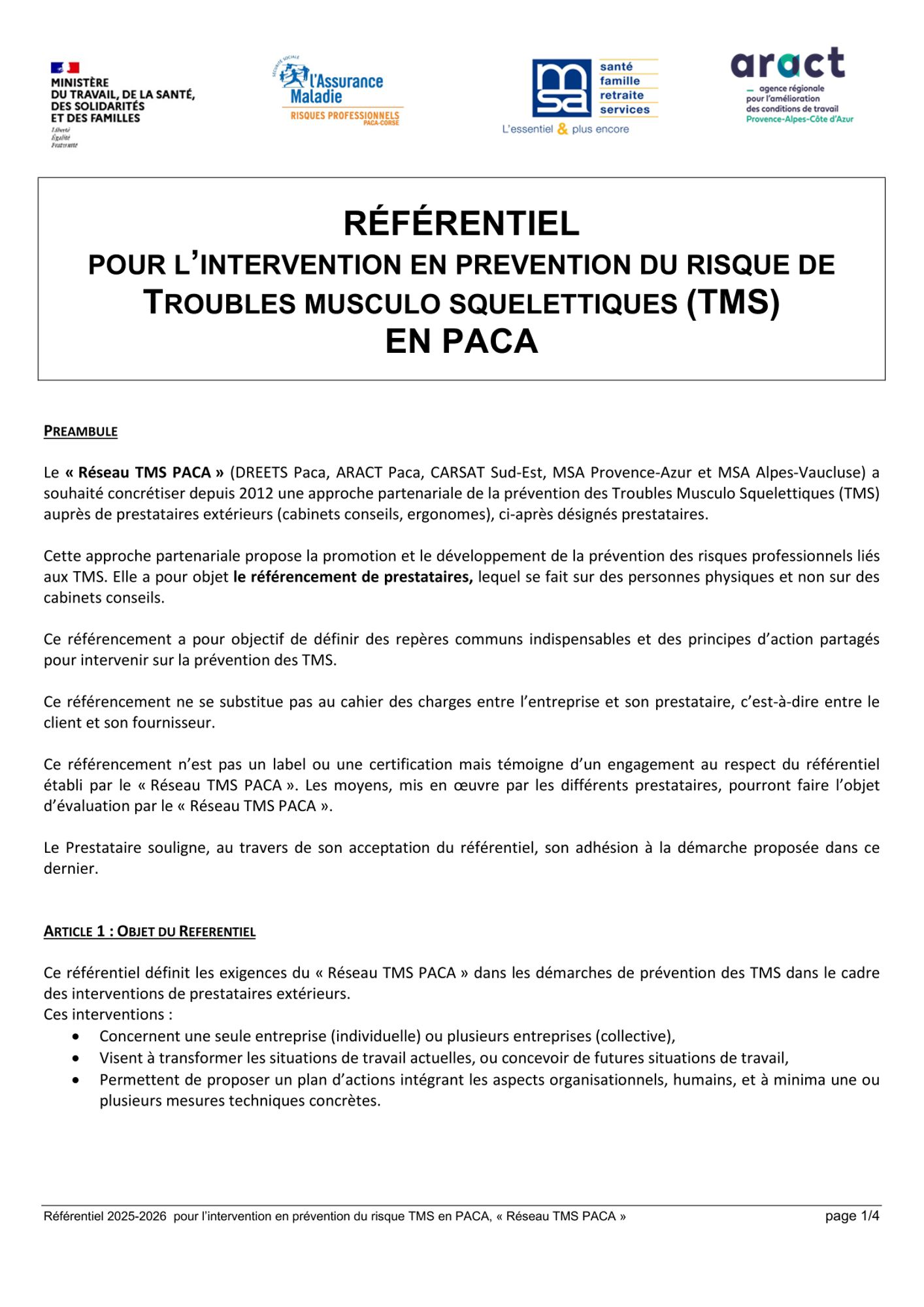 Afin de conforter la dynamique régionale et faciliter la mise en œuvre concrète de la démarche d'évaluation des Troubles Musculo Squelettiques (TMS) dans les entreprises, la DREETS PACA, la CARSAT Sud Est, l'ARACT, la MSA Provence-Azur et la MSA Alpes-Vaucluse ont mis en place un comité de pilotage et réalisé un référencement des ressources régionales susceptibles d'accompagner les entreprises sur le champ de la prévention des TMS et de la pénibilité.